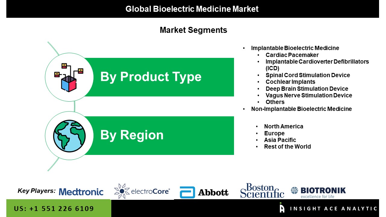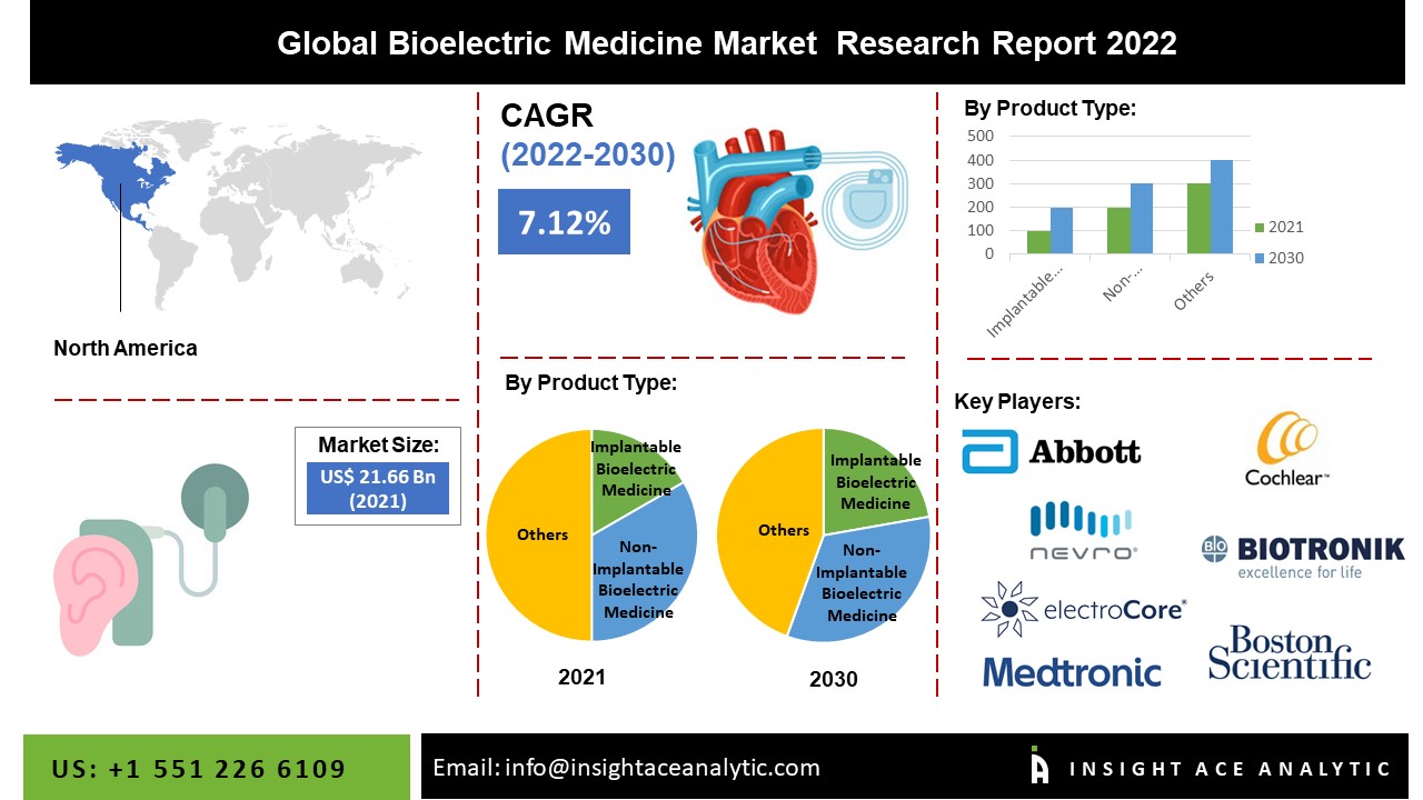 NEW JERSEY, SATTE NJ, USA, October 3, 2022 /EINPresswire.com/ -- The newly published report titled "Global Bioelectric Medicine Market By Product (Implantable Bioelectric Medicine (Cardiac Pacemaker, Implantable Cardioverter Defibrillators (ICD), Spinal Cord Stimulation Device, Cochlear Implants, Deep Brain Stimulation Device, Vagus Nerve Stimulation Device & Others) And Non-Implantable Bioelectric Medicine)- By Trends, Industry Competition Analysis, Covid-19 Analysis, Revenue (US$ Billions) and Forecast Till 2030." of InsightAce Analytic Pvt. Ltd. features detailed industry analysis and an extensive study on the market, exploring its significant factors.