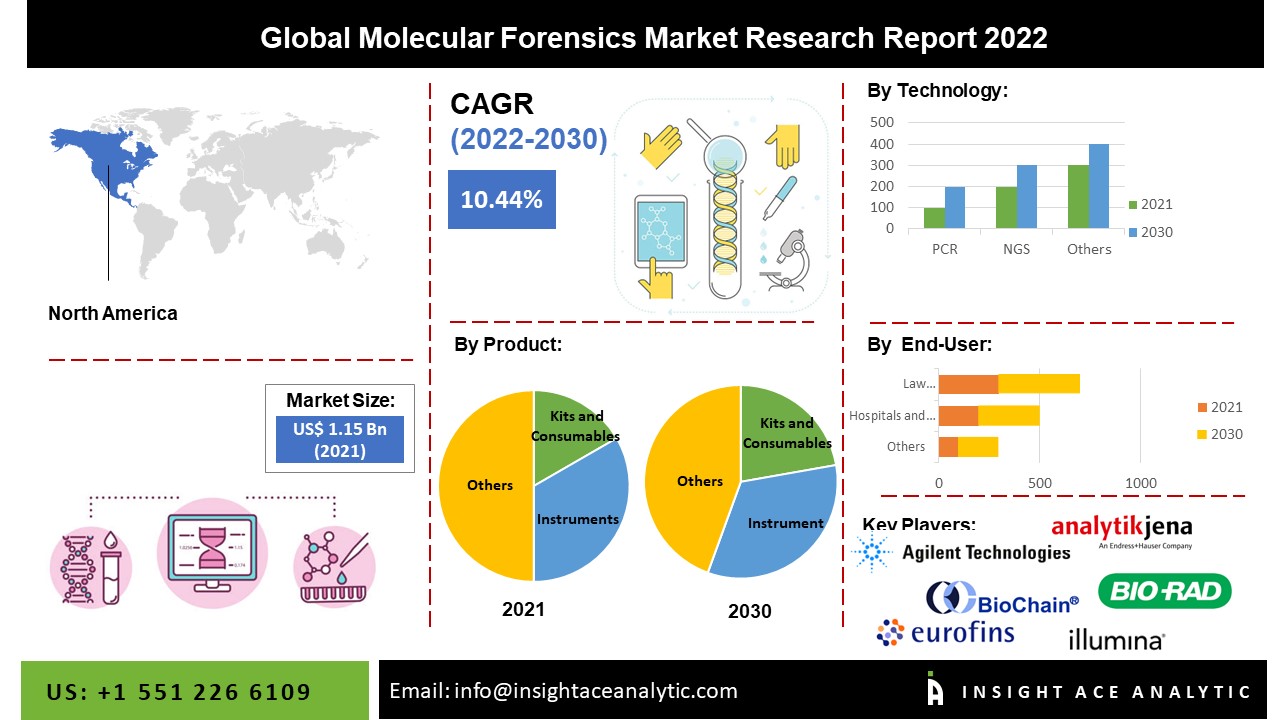 NEW JERSEY, SATTE NJ, USA, October 4, 2022 /EINPresswire.com/ -- InsightAce Analytic Pvt. Ltd. announces the release of a market assessment report on the "Global Molecular Forensics Market By Products (Kits And Consumables, Instruments, Software And Other Products), Technology (Polymerase Chain Reaction (PCR) (Real-time PCR (q-PCR) and Digital PCR (d-PCR)), capillary electrophoresis, NGS (SNP and STR Sequencing and mtDNA Sequencing), mass spectrometry (MS, Tandem MS and MS-FTIR) and other technologies), Application (Radioactive Toxicology, Nucleic Acid Analysis, Forensic Databasing, Microbial Forensics, And Other Applications), End-Users (Law Enforcement, Disaster Management, Hospitals And Healthcare Providers, And Other End Users)- Trends, Industry Competition Analysis, Revenue And Forecast To 2030."