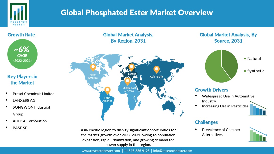 NEW YORK, UNITED STATES, October 10, 2022 /EINPresswire.com/ -- Research Nester published a report titled “Phosphate Ester Market: Global Demand Analysis & Opportunity Outlook 2031” which delivers detailed overview of the global phosphate ester market in terms of market segmentation by source, type, application, end user, and by region.Further, for the in-depth analysis, the report encompasses the industry growth indicators, restraints, supply and demand risk, along with detailed discussion on current and future market trends that are associated with the growth of the market.