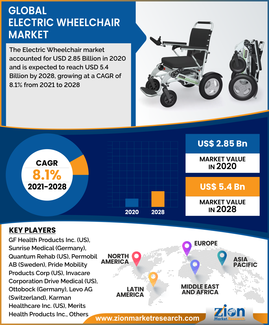 SUITE N202, NEW YORK, UNITED STATES, October 10, 2022 /EINPresswire.com/ -- According to analysts at Zion Market Research, the Electric Wheelchair market accounted for USD 2.85 Billion in 2020 and is expected to reach USD 5.4 Billion by 2028, growing at a CAGR of more than 8.1% from 2021 to 2028.
