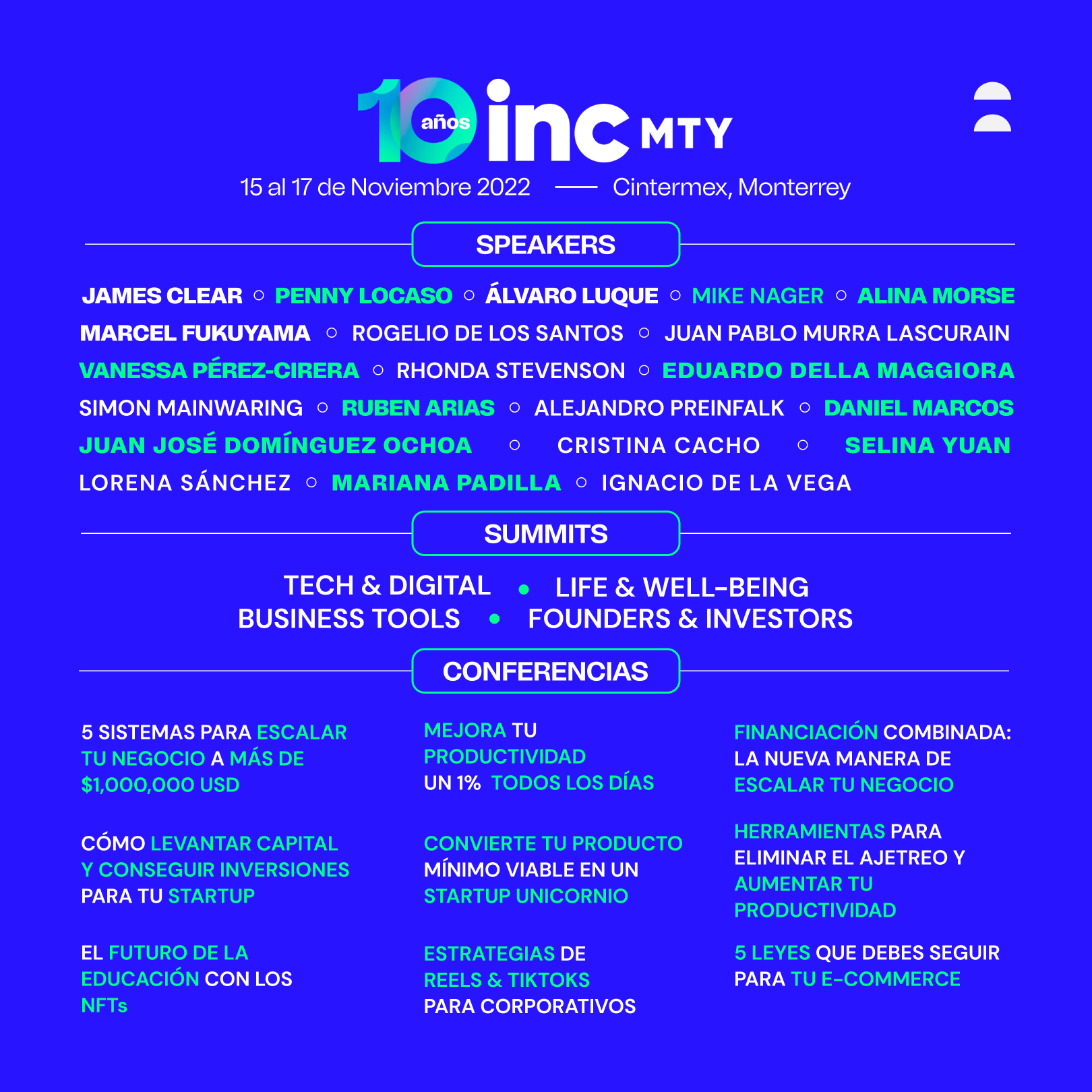 Esta es la décima edición del festival de INCmty y en la que año con año se ha apoyado al ecosistema emprendedor a través de una plataforma integral para toda la región. En este evento se contará con más de 200 momentos y actividades para Innovar, Desarrollar Conecciones y Crear Oportunidades.