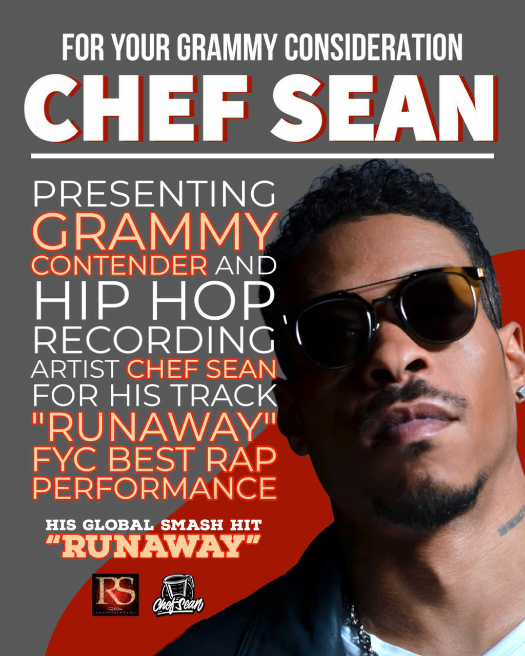 LOS ANGELES, CA, UNITED STATES, October 11, 2022 /EINPresswire.com/ -- Chef Sean is confirmed as a GRAMMY® Contender for “Best Rap Performance” for his single, “Runaway,” featuring Ben Official and Bz Bwai. “Runaway” is just one of the many hit tracks on his recent album, “My Life”. The award-winning rapper debuted his first solo EP in late April, introducing 18 hits including “Flex Off” and “Oh My God.” With “Runaway” landing on international music charts, the multi-talented hip-hop artist, songwriter, producer, and actor is preparing for this new opportunity. In addition, Chef Sean has been honored as “Artist of the Year” by the Core DJ Association.