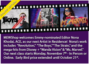 The next installment of MEWShop’s Six Week Intensive Workshop will be taught LIVE online and in person beginning on November 7, 2022. Class runs Monday through Friday from 10 AM ET to 6 PM ET. For more information on the Six Week Intensive Workshop or to register, please visit https://www.mewshop.com/6-week-overview. If you are interested in taking the class online please visit https://www.mewshop.com/six-week-intensive-online for all information and requirements. “We are extremely excited to announce that “Ms. Marvel” Editor Nona Khodai, ACE, will be our next Artist in Residence,” says MEWShop President, Jason Banke, "Nona’s amazing work on Disney + and “The Boys”, as well as her work as an Assistant Editor has led to her to where she is now, and why she is a perfect mentor for our students!” MEWShop’s early bird pricing ends October 21st.