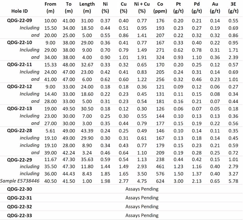 - The press release includes a summary table of assay results returned from selected holes completed; previously reported assay results are highlighted by a 35.63 metre-long intersection that returned 1.13% Ni + Cu, 238 ppm Co and 1.01 g/t Pt-Pd-Au, and includes higher grade sub-intervals of 1.44 % Ni, 1.49 % Cu, 461 ppm Co and 2.79 g/t Pt-Pd-Au over 11.80 metres and 1.85% Ni, 1.65% Cu (3.50% Ni + Cu), 576 ppm Co and 3.27 g/t Pt-Pd-Au over 8.43 metres in hole QDG-22-29. Of note, a one-metre-long sample from hole QDG-22-29 containing heavy net-texture chalcopyrite and pyrrhotite (35-40% total sulphides) returned 1.98% Ni + 2.77% Cu (4.75% Ni + Cu), 624 ppm Co and 5.78 g/t Pt-Pd-Au. The release also has an image of drill sections, and a plan map showing the locations of selected drill holes completed at the Fortin Sill Zone.