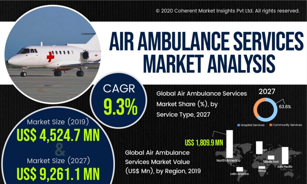 SEATTLE, UNITED STATES, UNITED STATES, October 13, 2022 /EINPresswire.com/ -- Air ambulances are specialized aircraft designed to provide aerial medical services in emergencies where ground-based medical assistance takes time to arrive. Air ambulances are airplanes and helicopters that have full medical facilities and are designed to provide medical assistance in remote areas where road-based ambulance services are not available. The increasing frequency of accidents and other life-threatening hazards such as major strokes, heart attacks, trauma and other medical conditions has increased the demand for effective ambulance services, ultimately leading to the rise of air ambulance services worldwide.