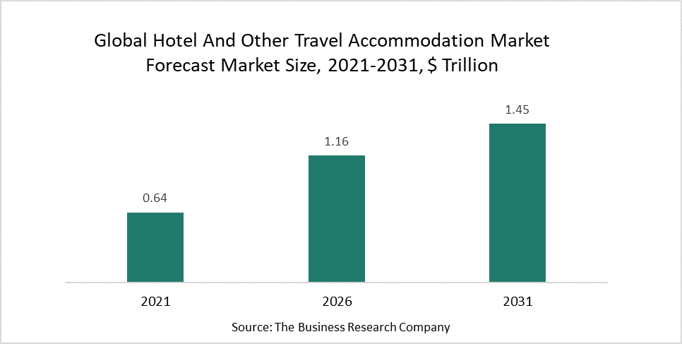 The hotel and other travel accommodation market size is expected to grow from $0.64 trillion in 2021 to $1.16 trillion in 2026 at a rate of 12.5%. The hotel and other travel accommodation market share is then expected to grow at a CAGR of 4.6% from 2026 and reach $1.45 trillion in 2031.