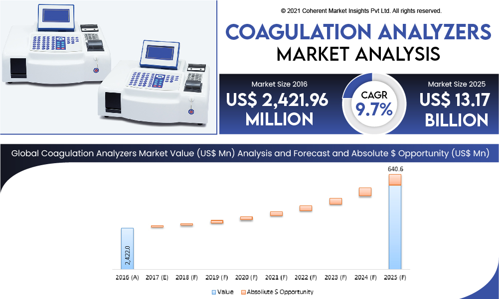 The global Coagulation Analyzers market generated $2,421.96 million in 2021 and is projected to reach $13.17 billion by 2028, growing at a CAGR of 9.7% over the forecast period (2022 โ 2028).