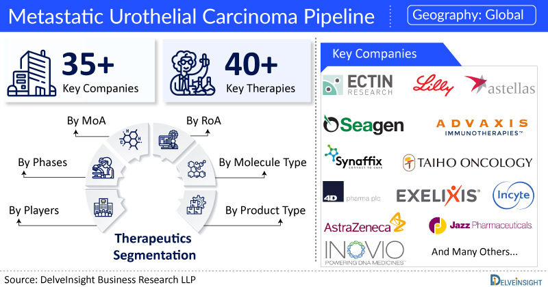 - DelveInsight’s metastatic urothelial carcinoma pipeline report depicts a robust space with 35+ active players working to develop 40+ pipeline therapies for metastatic urothelial carcinoma treatment.