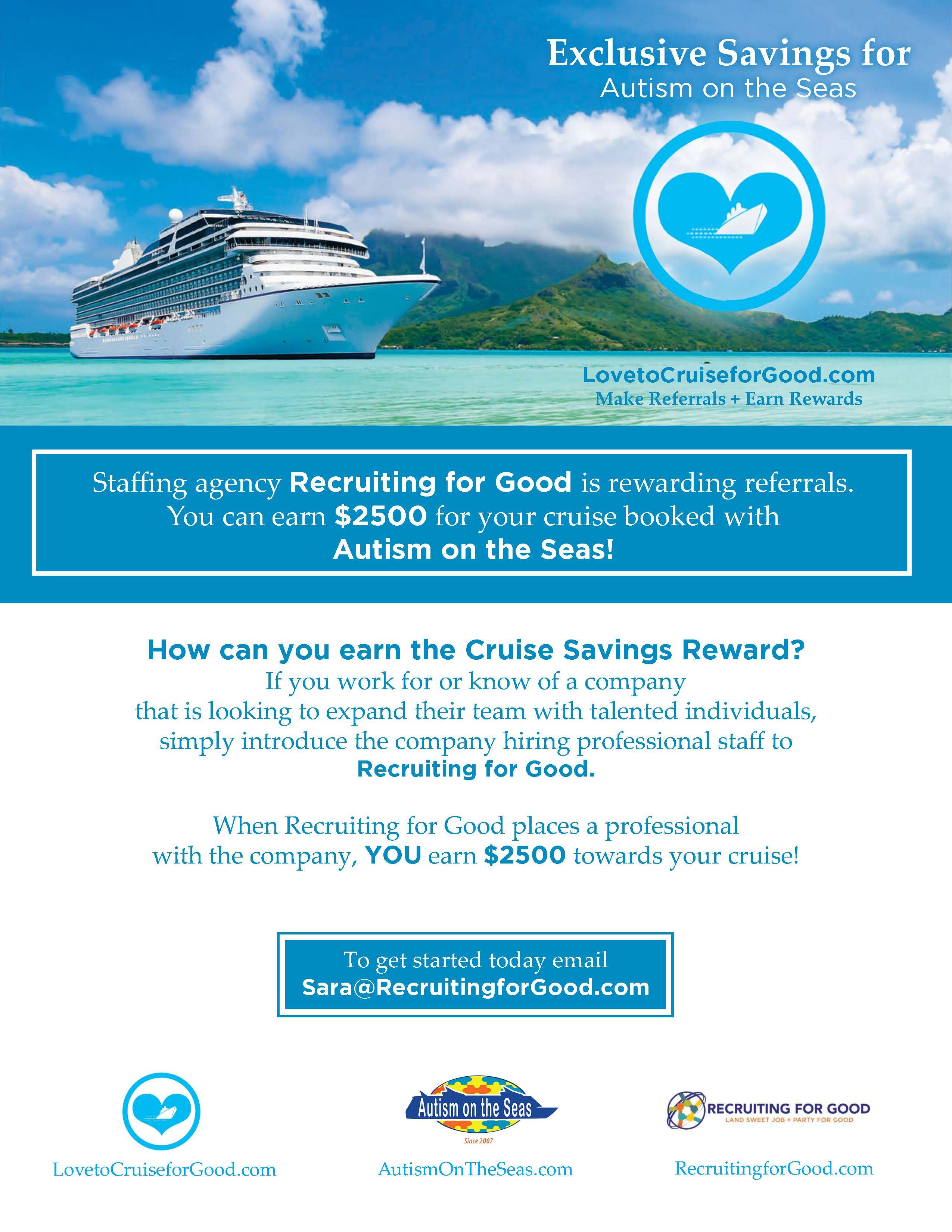 Participate in Recruiting for Good's referral program to earn cruise travel savings #recruitingforgood #lovetocruise www.LovetoCruiseforGood.com
