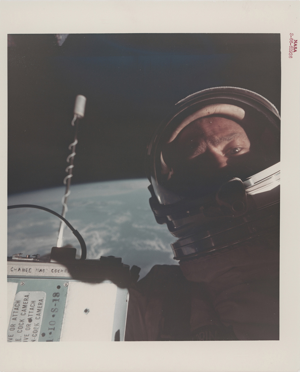 Lot 159 ($8,000–12,000), taken by Buzz Aldrin in 1966, is the first selfie in outer space. Lot 195 ($1,500—2,500) is the first selfie in lunar orbit. Lot 306 ($2,500–4,000) may be considered the first moon selfie and shows Pete Conrad fully reflected in the visor of fellow astronaut Alan Bean.