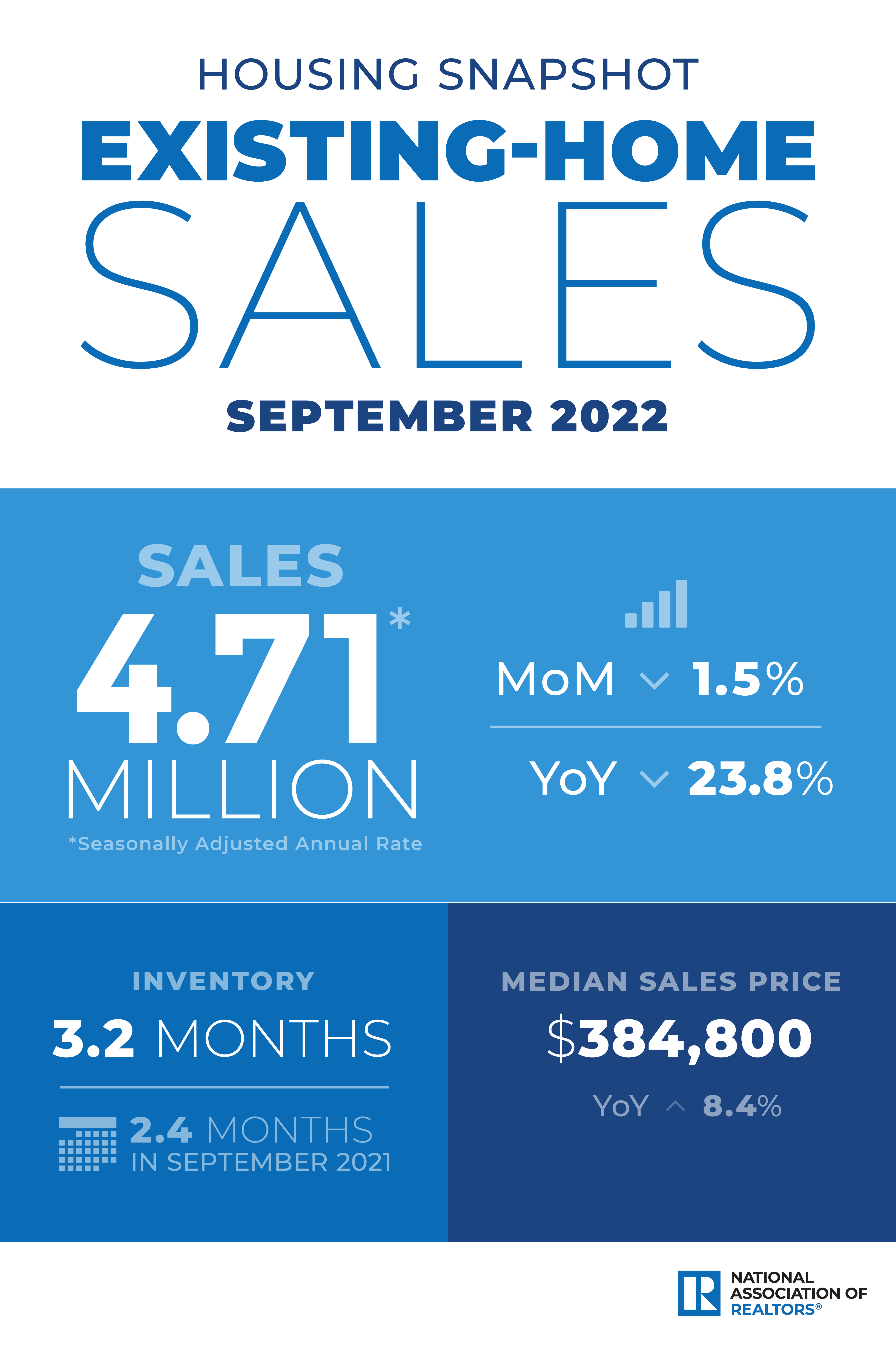 Total existing-home sales,[i] https://www.nar.realtor/existing-home-sales, completed transactions that include single-family homes, townhomes, condominiums and co-ops, retracted 1.5% from August to a seasonally adjusted annual rate of 4.71 million in September. Year-over-year, sales waned by 23.8% (down from 6.18 million in September 2021).
