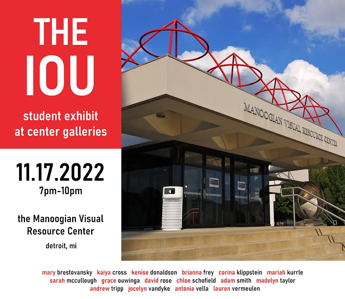 The show will be held on November 17th from 7:00 PM to 10:00 PM at the Center Gallery, located in the Manoogian Visual Resource Center at: 301 Frederick Douglass St. Detroit, MI 48202.