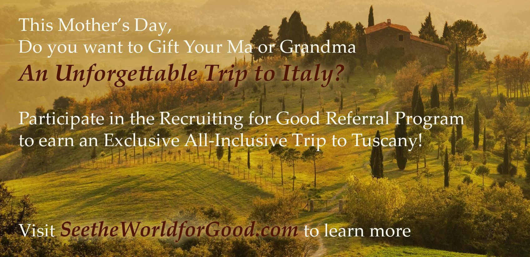 Recruiting for Good just launched a meaningful travel reward for families to gift the perfect sweet trips. And created an exclusive travel reward for Mother's Day; 'Gift Mom a Sweet Trip to Tuscany!'