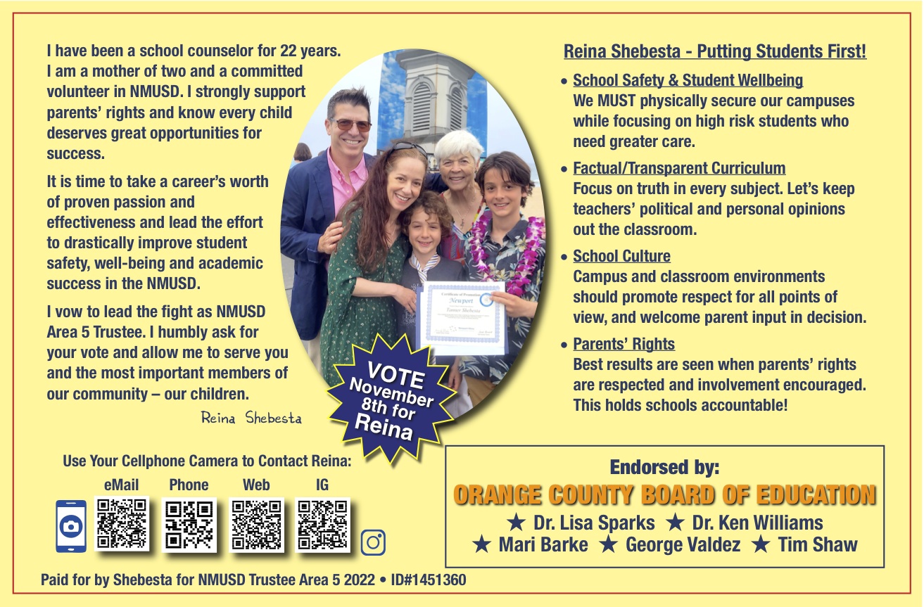 NEWPORT BEACH, CALIFORNIA, UNITED STATES, October 26, 2022 /EINPresswire.com/ -- Data is released. Newport Mesa Unified sees a significant decline in students' academics. It is time for new leadership and many agree it is time for Reina Shebesta to take the reigns in NMUSD.