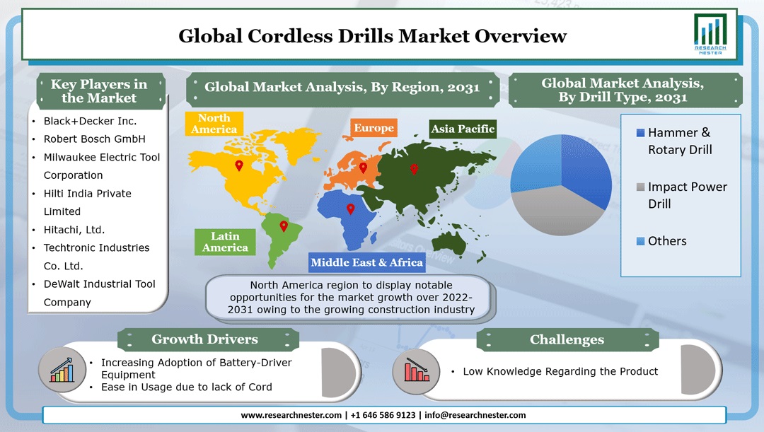 NEW YORK CITY, NEW YORK, UNITED STATES, October 31, 2022 /EINPresswire.com/ -- Research Nester published a report titled “Cordless Drills Market: Global Demand Analysis & Opportunity Outlook 2031” which delivers detailed overview of the global cordless drills market in terms of market segmentation by drill type, battery type, application, and by region.Further, for the in-depth analysis, the report encompasses the industry growth indicators, restraints, supply and demand risk, along with detailed discussion on current and future market trends that are associated with the growth of the market.