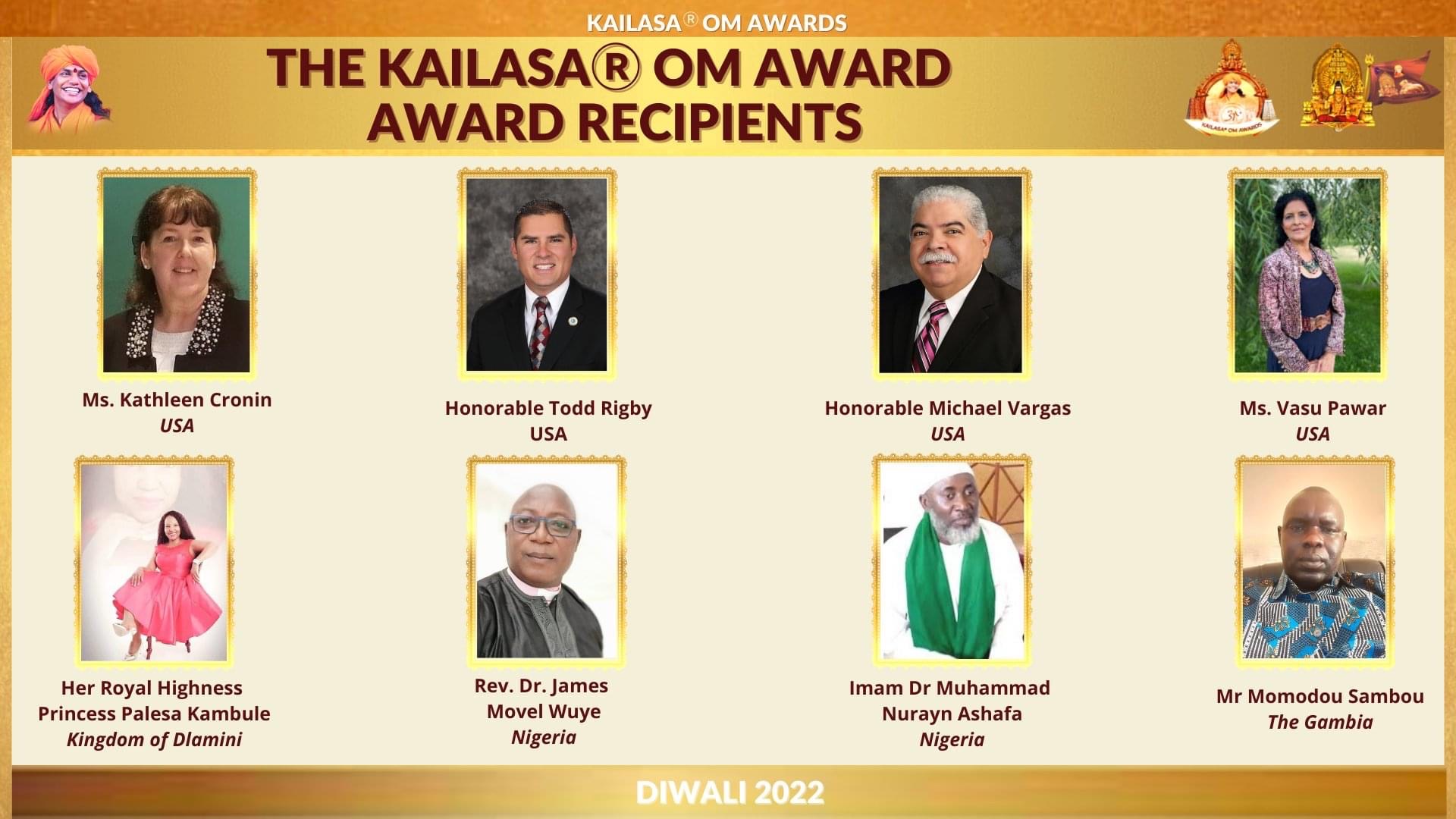 The KAILASA Om AwardSM was conferred to the following dignitaries in recognition of their hard work, achievements and efforts towards global peace and co-existence: