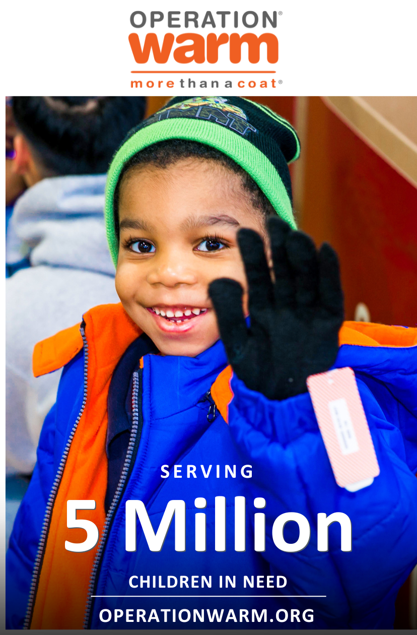 GLEN MILLS, Pa., Nov. 01, 2022 (GLOBE NEWSWIRE) -- National nonprofit Operation Warm is on track to serve its five millionth child this year. As the largest nonprofit of its kind, Operation Warm offers brand-new coats and shoes as a bridge to connect underserved families and their children with the resources they need to thrive.