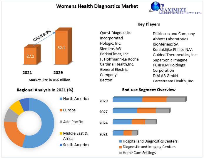 PUNE, MAHARASHTRA, INDIA, November 2, 2022 /EINPresswire.com/ -- Maximize Market Research has published a report on the Women’s Health Diagnostics Market that provides a detailed analysis for the forecast period of 2022 to 2029. According to the report, the Women’s Health Diagnostics Market was valued at USD 27.1 Billion in 2021 and is expected to reach USD 52.1 Billion by 2029, at a CAGR of 8.5% during the forecast period.