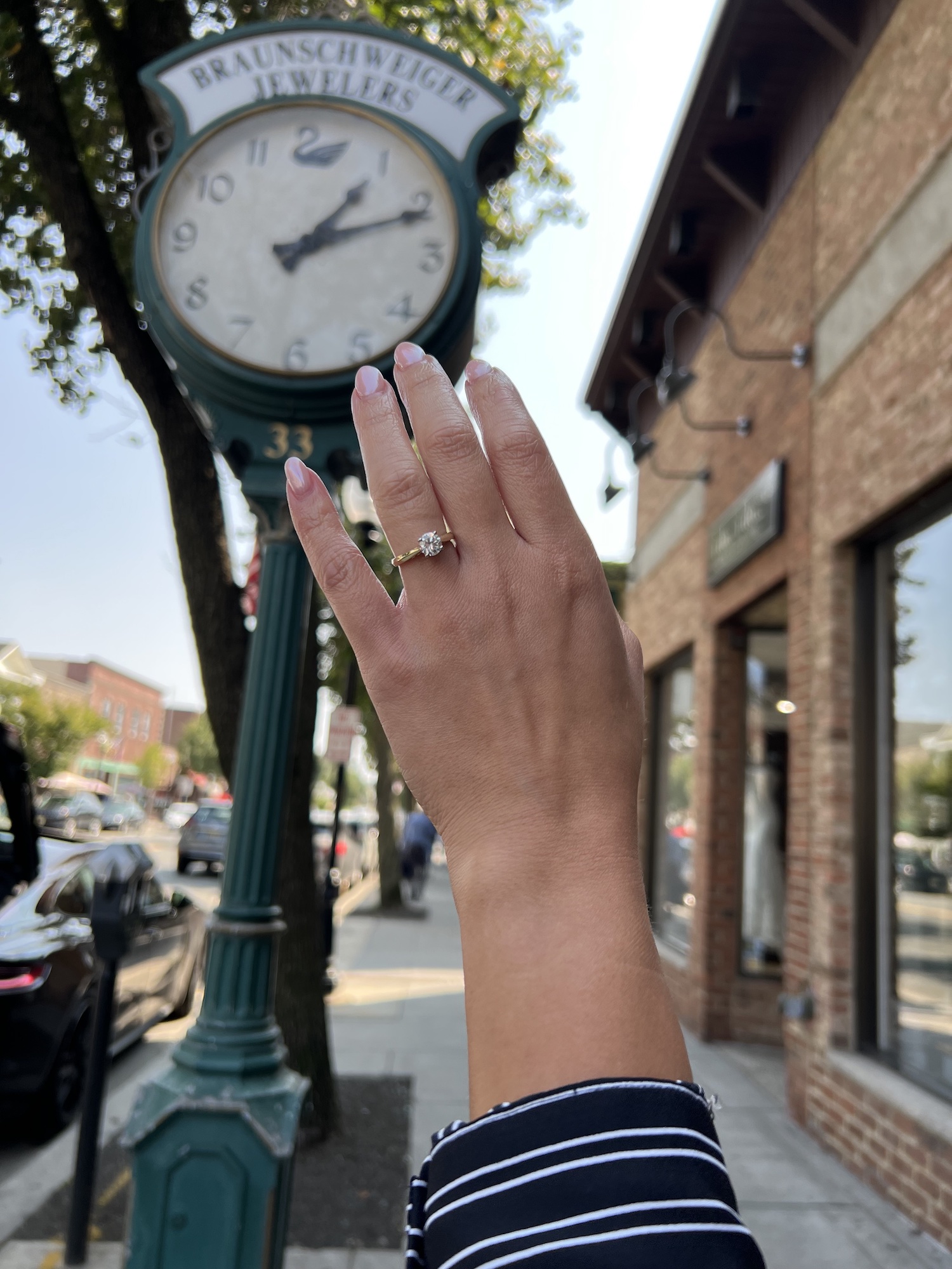 Photo of a woman's hand with a diamond engagement ring in front of Braunschweiger Jewelers' storefront.