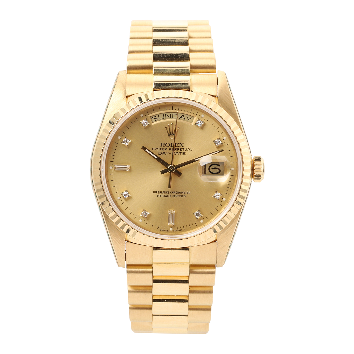 Two Day-Date “Presidents” in the auction include Ref. 18038, circa 1988, with 18kt yellow gold case and bracelet and champagne diamond dial, serviced by Rolex in August 2002 (est. $28,000-$35,000); and Ref. 18238, with 18kt yellow gold case on an 18kt yellow gold President band. A recent service included all new crystal, crown, crown tube and gaskets (est. $16,000-$20,000).