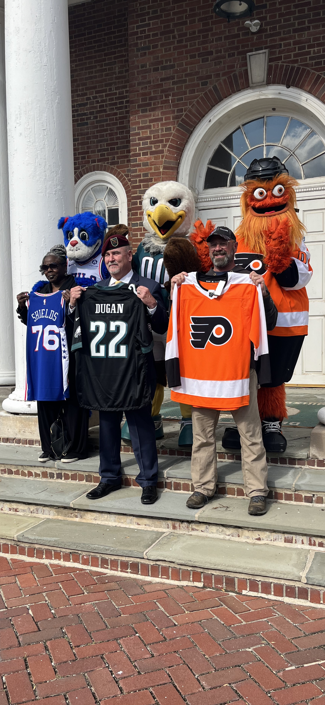 From left to right: Sgt. Linda Shields, Jersey Presented by Philadelphia 76’ers Mascot, Franklin, Judge Patrick Dugan, Jersey Presented by Philadelphia Eagles Mascot, Swoop, • CPT Dan Ullmann, Army Infantry Captain, Jersey Presented by Philadelphia Flyers