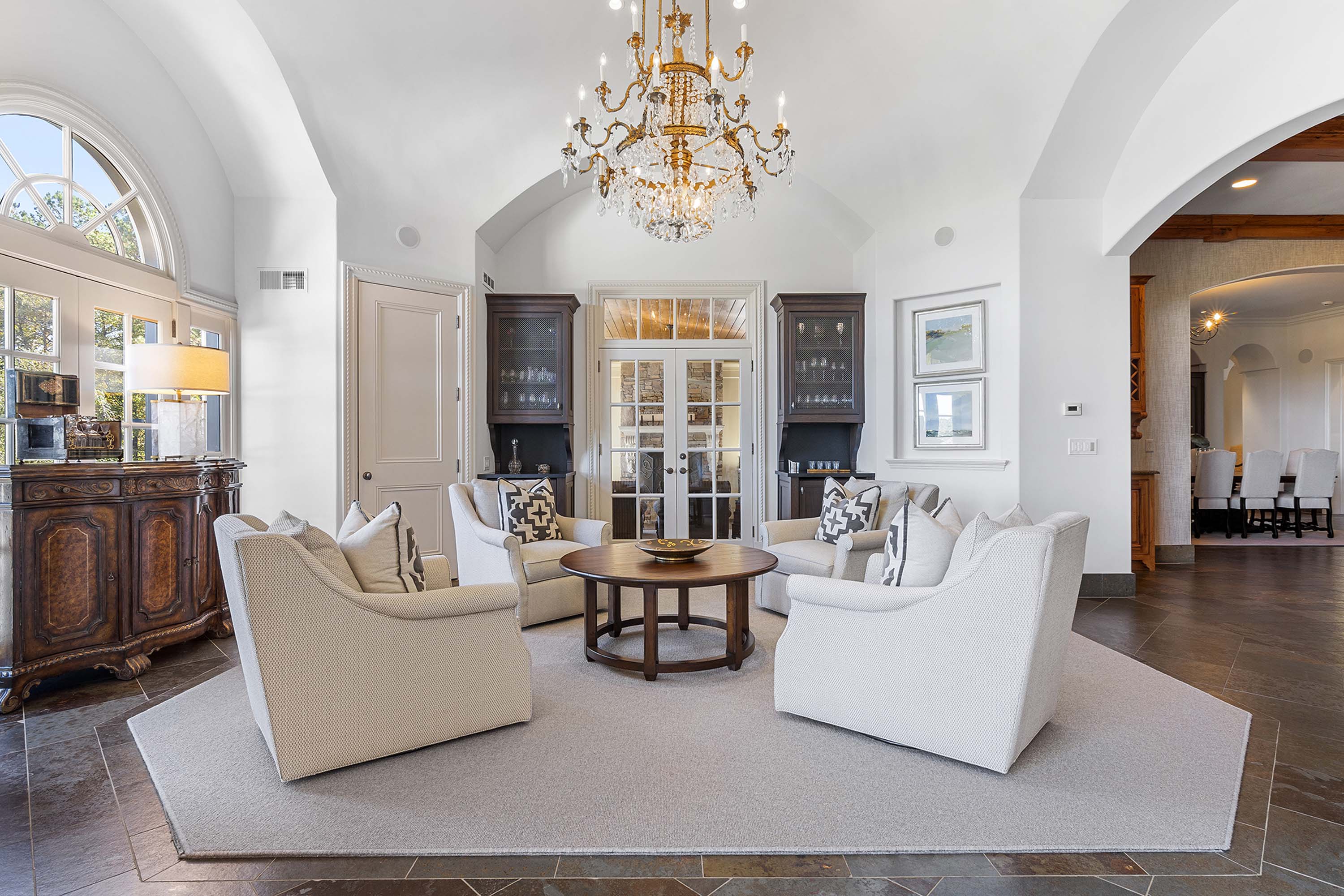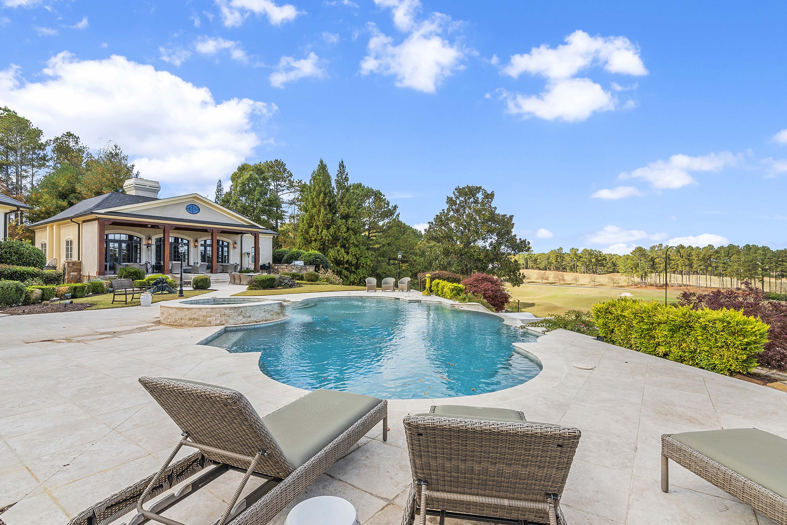 The magnificent footprint of your Hawks Ridge estate impresses you at first glance, yet the wide front porch welcomes you like an old friend. Elegantly lofted ceilings, oversized windows, and luxurious finishes abound inside and provide the perfect canvas for entertaining on a grand scale. Host a bridge or poker tournament from your game room, a wine tasting with vintages from your cellar, or watch the big game around your splendid bar. Music lovers will treasure the professionally outfitted recording studio. The delights don’t end inside. Step outside and admire your expansive and impeccably landscaped 8+ acres. A multitude of settings for outdoor entertaining await with your very own tennis court, basketball court, and a pool-house with a stage perfect for entertaining. Gather in the terraced pool and hot tub overlooking the golf course. Two outdoor kitchens are ideal anchors for casual get-togethers. For an intimate al fresco conversation, a private courtyard awaits.