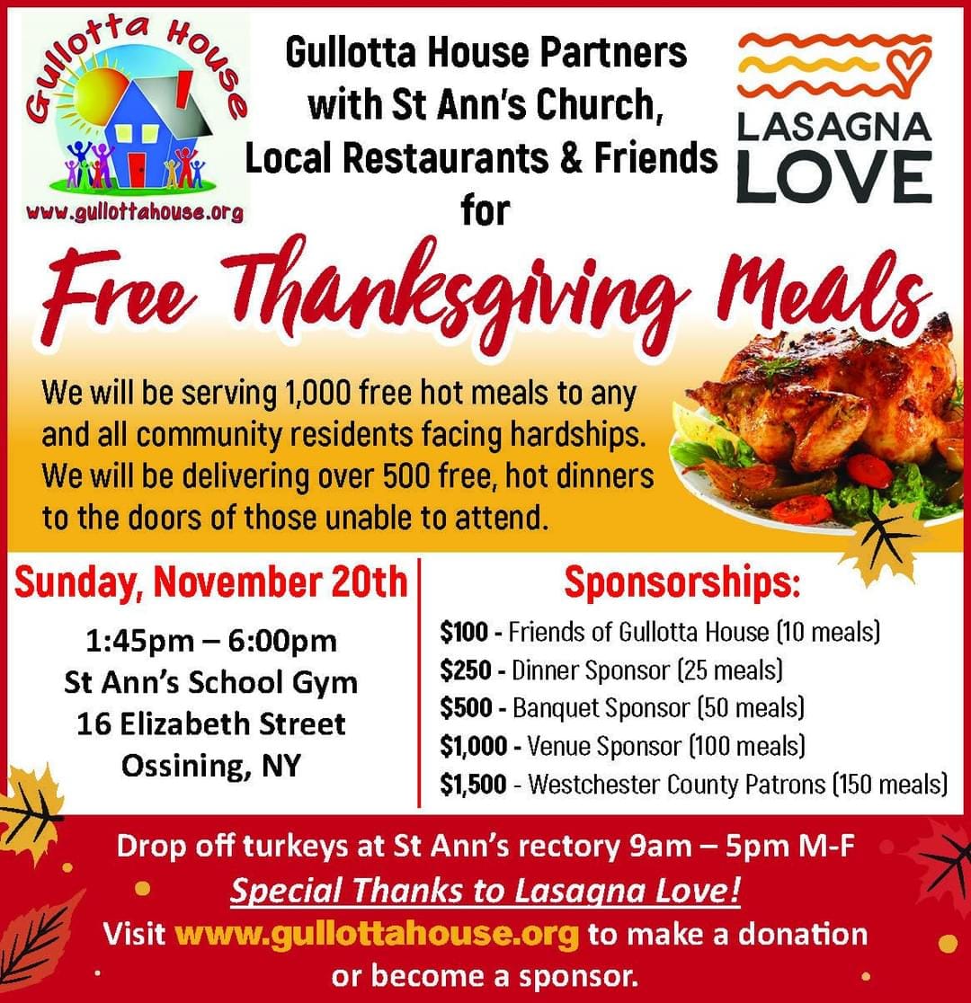 OSSINING , NEW YORK, UNITED STATES , November 7, 2022 /EINPresswire.com/ -- Gullotta House, a local Westchester County not-for-profit organization, will be partnering with St. Ann’s Church and local area restaurants to provide free Thanksgiving meals to community residents facing hardships on Sunday, November 20, 2022, from 1:45 pm – 6:00 pm at St. Ann’s School Gym located at 16 Elizabeth Street in Ossining, NY. This year’s event will have Gullotta House providing 1,000 free hot meals, with grab and go meals available as well. In addition, Gullotta House will also be delivering over 500 meals to the doors of those who are unable to attend.
