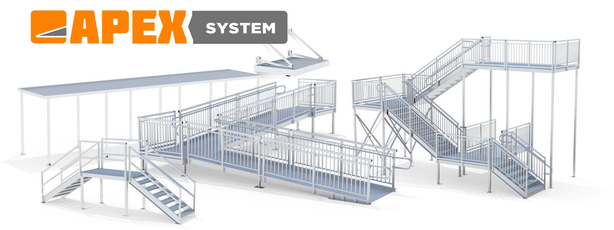 CINCINNATI, Nov. 08, 2022 (GLOBE NEWSWIRE) -- Upside Innovations, a SixAxis company, has launched an innovative new modular access system. The APEX System is a modular, prefabricated line of ADA, IBC, and OSHA-compliant stairs, ramps, and canopies designed to improve safe access for businesses in a wide variety of industrial, commercial, educational, and professional sectors. Industrial-grade aluminum components bolt together to create infinite configurations, making the APEX System ideal as the needs of an installation change. By eliminating the need for custom fabrication and time-consuming engineering, the APEX System reduces costs, installation time, and complexity.