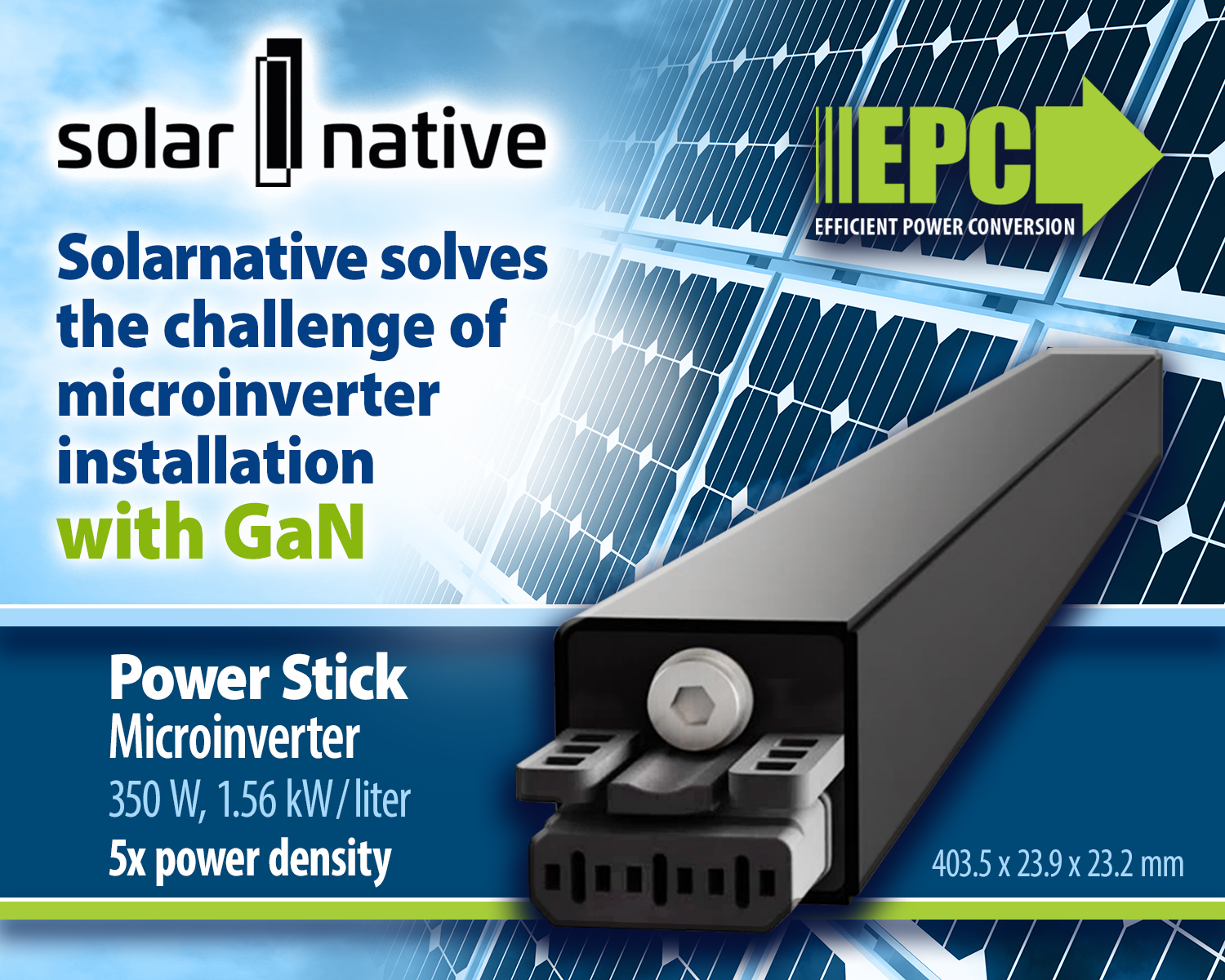 “Solar applications are putting higher demands on power devices for thermal, reliability, and power density, and silicon-based power conversion is not keeping pace,” said Alex Lidow, CEO of EPC. “We are delighted to work with Solarnative to implement GaN as 3rd generation of semiconductors into their microinverters, allowing customers to simplify installation for easier microinverters and green energy adoptions.”