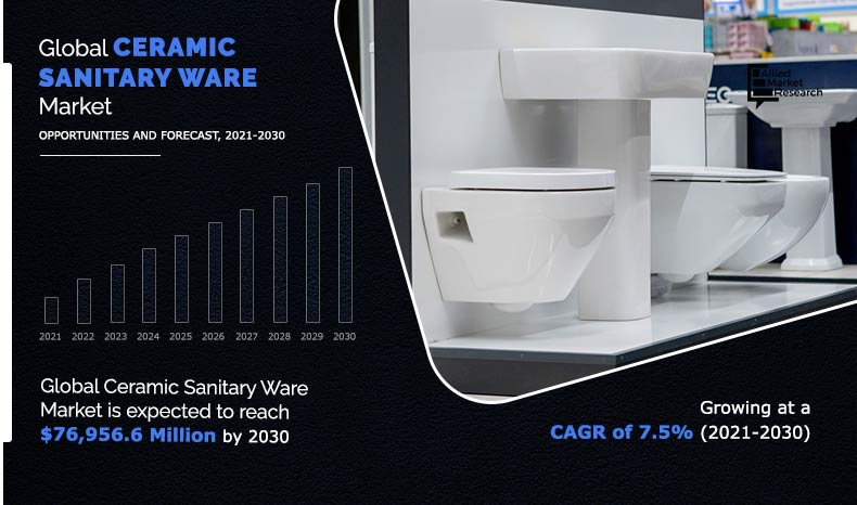 PORTLAND, OR, UNITES STATES, November 9, 2022 /EINPresswire.com/ -- The global ceramic sanitary ware market was valued at $36,544.8 million in 2020, and is projected to reach $76,956.6 million by 2030, registering a CAGR of 7.5% from 2021 to 2030. Ceramic sanitary wares include a variety of equipment and fixtures that are used for sanitary and internal plumbing applications. Water closets, bath tubs, basins, and sinks are gaining high traction in the ceramic sanitary ware industry. These goods are manufactured from a variety of raw materials, the majority of which are tri-axial compounds, including quartz, feldspar, and clay. Ceramic sanitary ware products are cost-effective, easy to maintain, and scratch & chemical resistant. Thus, multiple benefits associated with ceramic sanitary wares flourish the growth of the global market.