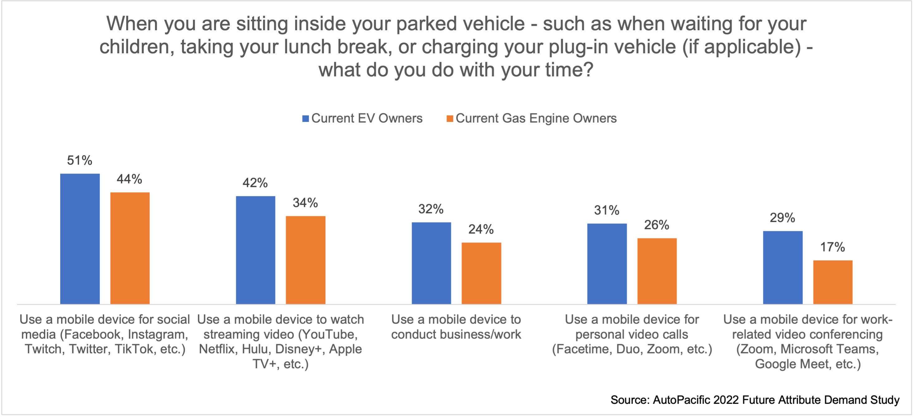 When asked about activities they participate in when sitting in a parked vehicle, such as when waiting for their children, taking a lunch break, or charging their vehicle, respondents who currently own an EV are more likely to be active on their mobile devices, compared to owners of all other engine types. From using a mobile device for social media (+7%pts) to using a mobile device for work-related video conferencing (+12%pts), EV owners are more likely to use their mobile devices in their parked vehicle and are therefore more likely to be connected to the online universe. “Using mobile devices while parked leads to higher demand for vehicle features and technologies that not only enable the use of their devices, but also provide comfort and convenience while doing so,” says AutoPacific President and Chief Analyst, Ed Kim.