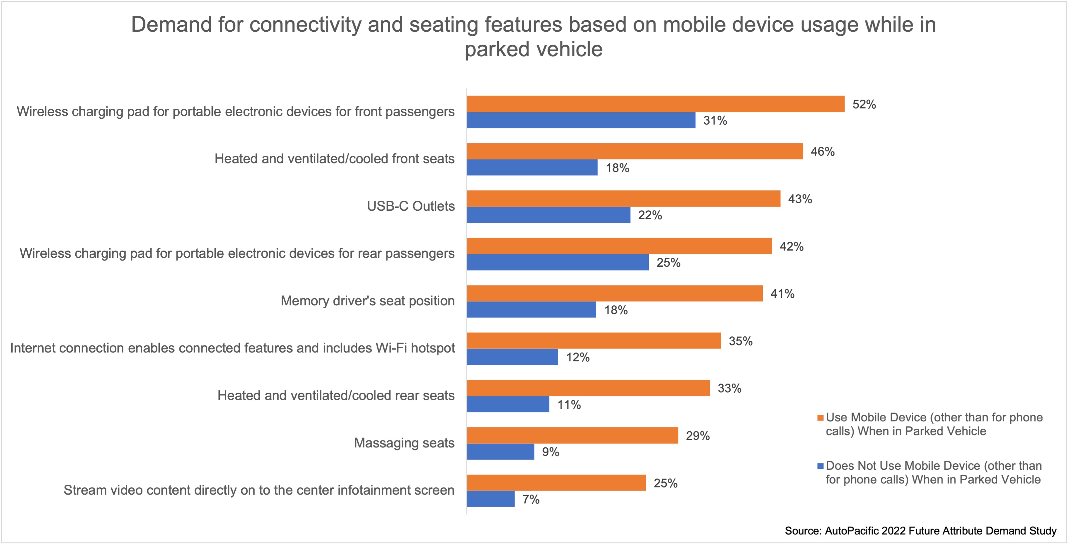 Respondents who use their mobile device for parked vehicle activities other than phone calls have higher demand for connectivity features like USB-C outlets, in-vehicle internet connections and video streaming, as well as seating features like heated and ventilated front seats, memory driver’s seat position and massaging seats. “Imagine you’ve moved your seat back as far as it will go to relax and watch a movie on your center screen or make room to work on your laptop and now you need to go back to driving position. A memory seat position feature makes this task more convenient,” explains Kim.