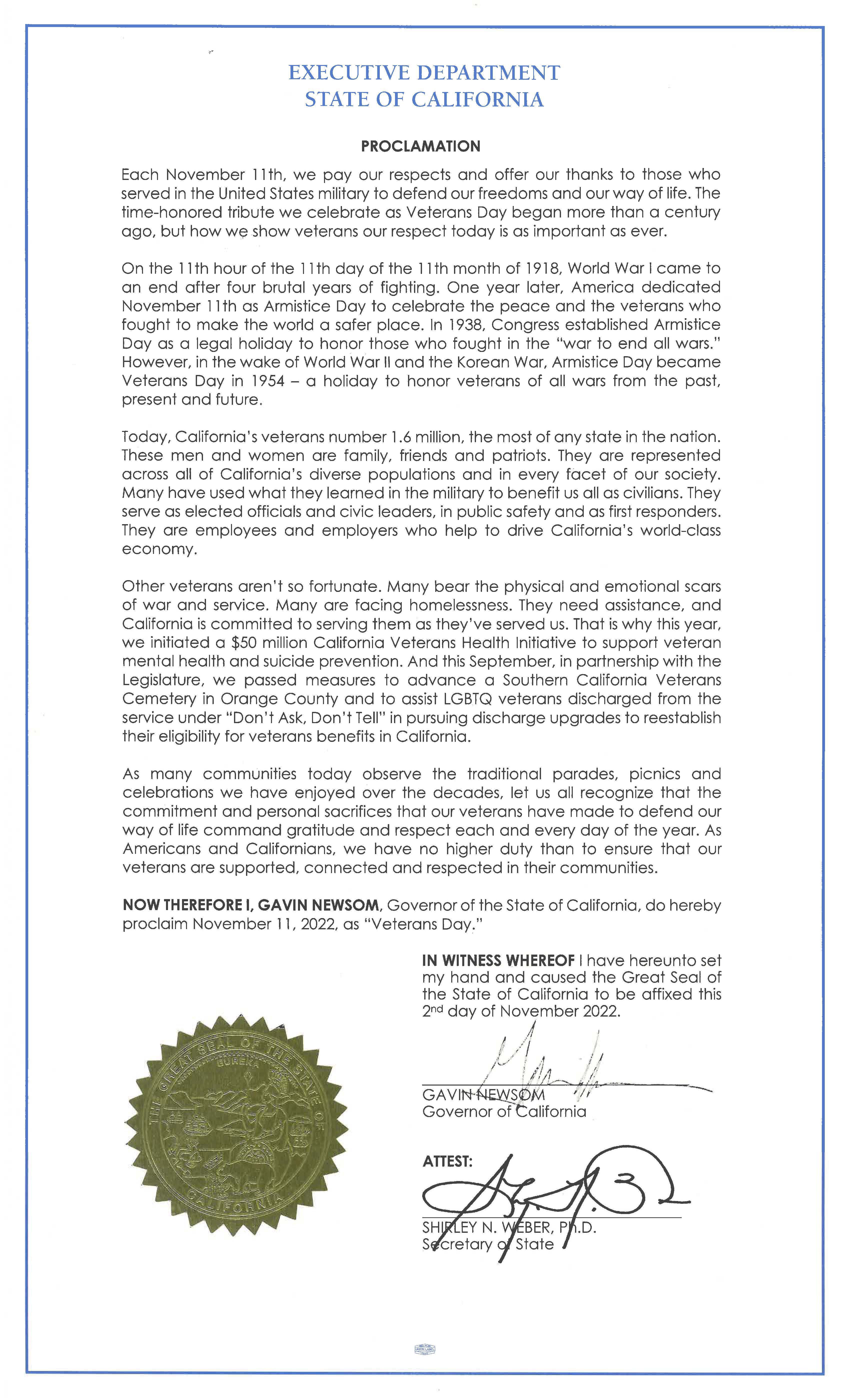 NOW THEREFORE I, GAVIN NEWSOM, Governor of the State of California, do hereby proclaim November 11, 2022, as “Veterans Day.”IN WITNESS WHEREOF I have hereunto set my hand and caused the Great Seal of the State of California to be affixed this 2nd day of November 2022.