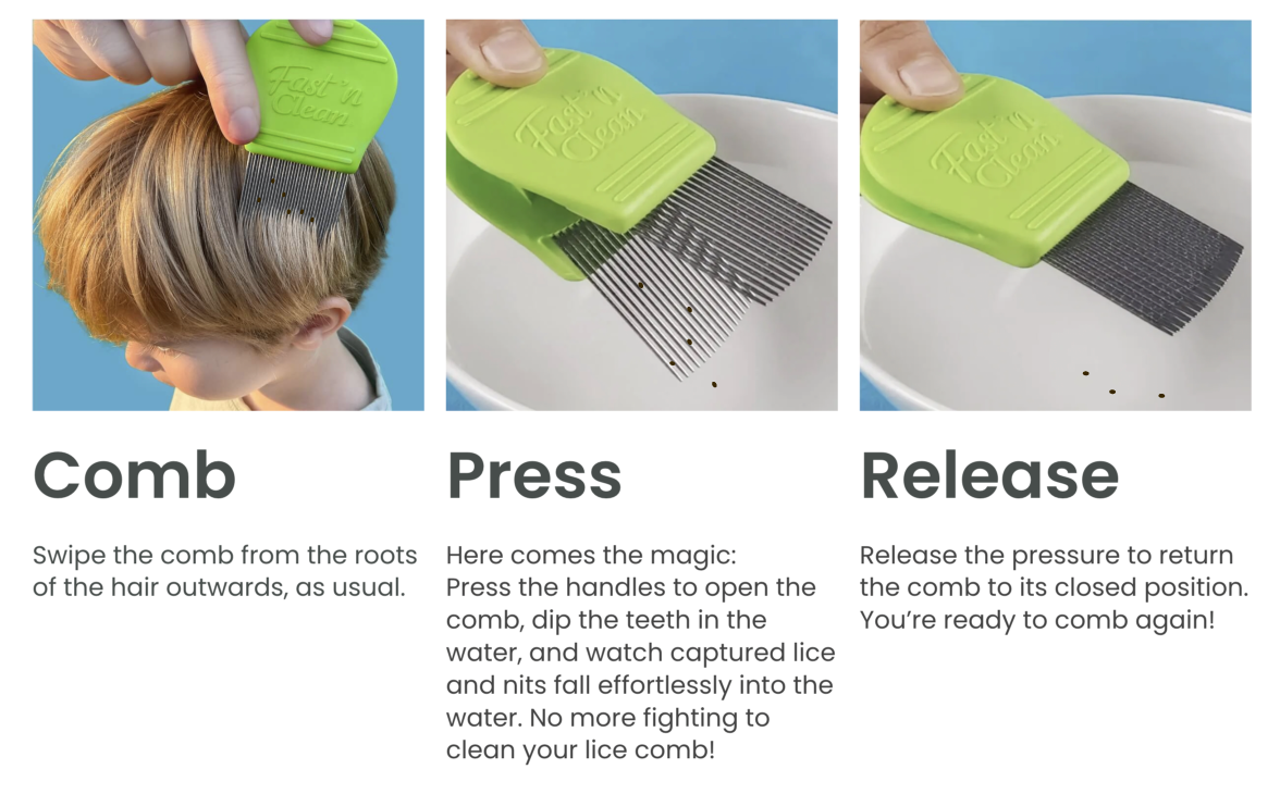 Below are instructions with visuals for how to use the Fast ‘n Clean Lice Comb. To learn more about the Fast n’ Clean Lice Comb from JG&JG, visit licecombreinvented.com or place an order on Amazon.