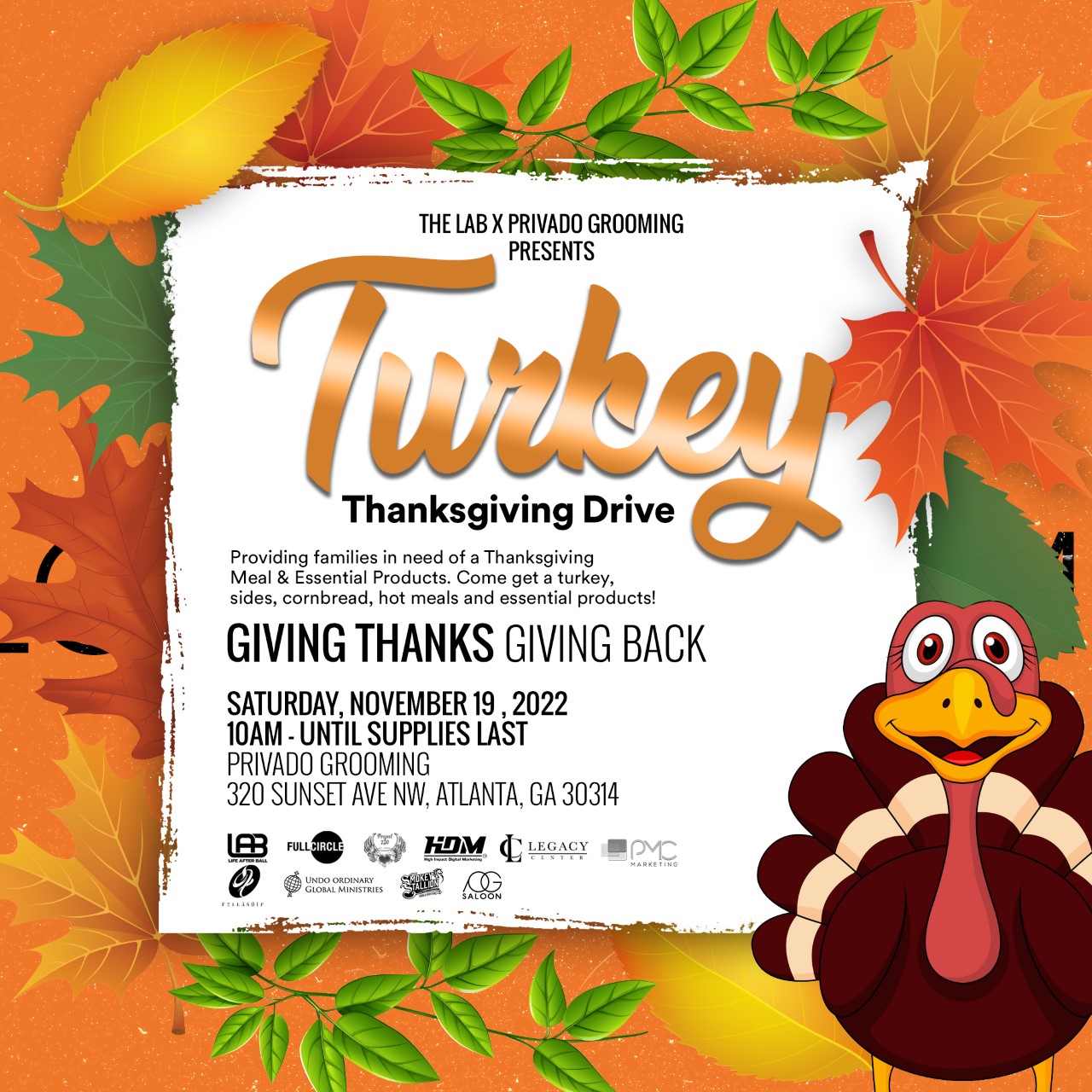 The Thanksgiving drive-thru food distribution will take place on Saturday, November 19, 2022, from 10:00 am – until supplies last at Privado Grooming located at 320 Sunset Ave NW. Atlanta, GA 30314.