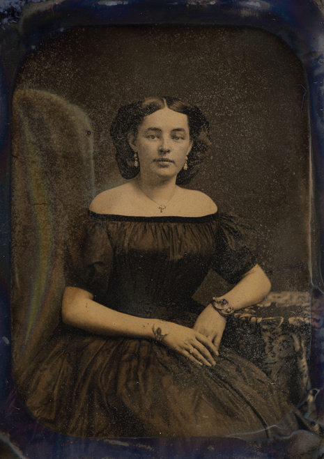 A daguerreotype of an elegantly dressed, unidentified woman was among the photographs recovered from the fabled “Ship of Gold,” the S.S. Central America that sank in 1857. (Image courtesy of Holabird Western Americana Collections.)