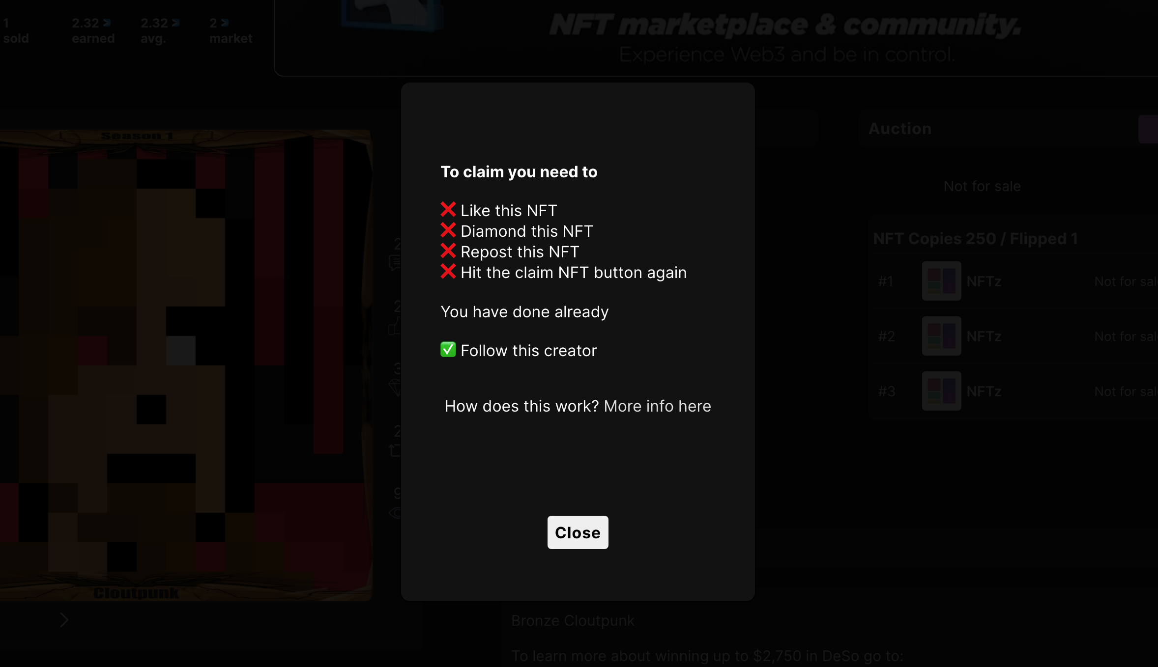 At launch, NFTz has included the ability for a creator to require users to Like, Diamond and Repost their NFT on the Deso blockchain, follow their DeSo account and/or Retweet a specific post in order to claim their free NFT. More options for creators are already in the works as NFTz seeks to bridge the gap between Web2 and Web3 social. Such options could, in the future, require users to subscribe to specific content or even own other specific NFTs before being able to claim their free digital asset.