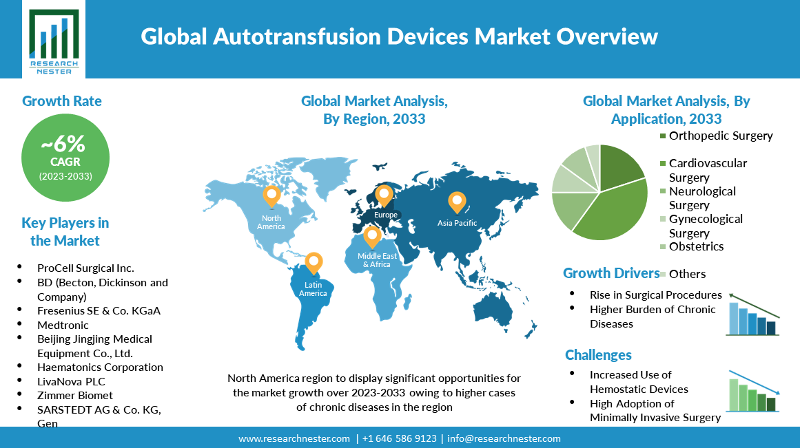 NEW YORK, NEW YORK, UNITED STATES, November 16, 2022 /EINPresswire.com/ -- Research Nester published a report titled “Autotransfusion Devices Market: Global Demand Analysis & Opportunity Outlook 2033” which delivers detailed overview of the global autotransfusion devices in terms of market segmentation by application, product type, end user, and by region.Further, for the in-depth analysis, the report encompasses the industry growth indicators, restraints, supply and demand risk, along with detailed discussion on current and future market trends that are associated with the growth of the market.