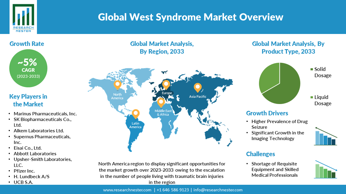 NEW YORK, NEW YORK, INDIA, November 18, 2022 /EINPresswire.com/ -- Research Nester published a report titled “West Syndrome Market: Global Demand Analysis & Opportunity Outlook 2033” which delivers a detailed overview of the global west syndrome market in terms of market segmentation by product type, administration route, treatment, distribution channel, end-user, by region.Further, for the in-depth analysis, the report encompasses the industry growth indicators, restraints, and supply and demand risk, along with a detailed discussion of current and future market trends that are associated with the growth of the market.