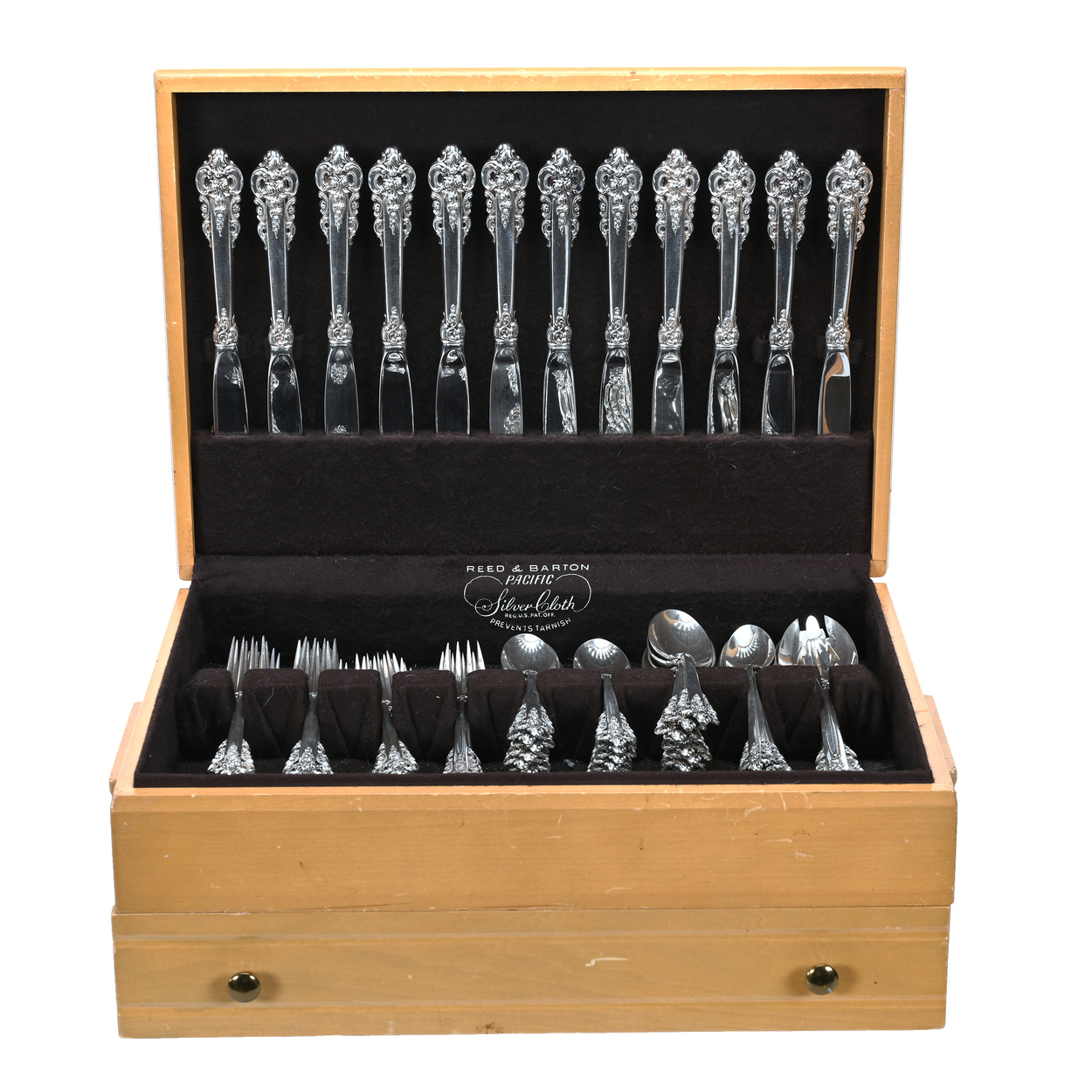 Another noteworthy lot is the 116-piece sterling silver flatware set by Wallace in the Grand Baroque pattern, including 12 dinner forks (795 grams), 12 salad forks (525 grams), 23 tea spoons (800 grams), 12 place spoons (715 grams), 12 ice beverage spoons (435 grams), 12 dinner knives (1,030 grams), 11 solid silver serving pieces (540 grams), and 17 assorted pieces with stainless blades and/or wood (920 grams, the weight including stainless blades and wood).