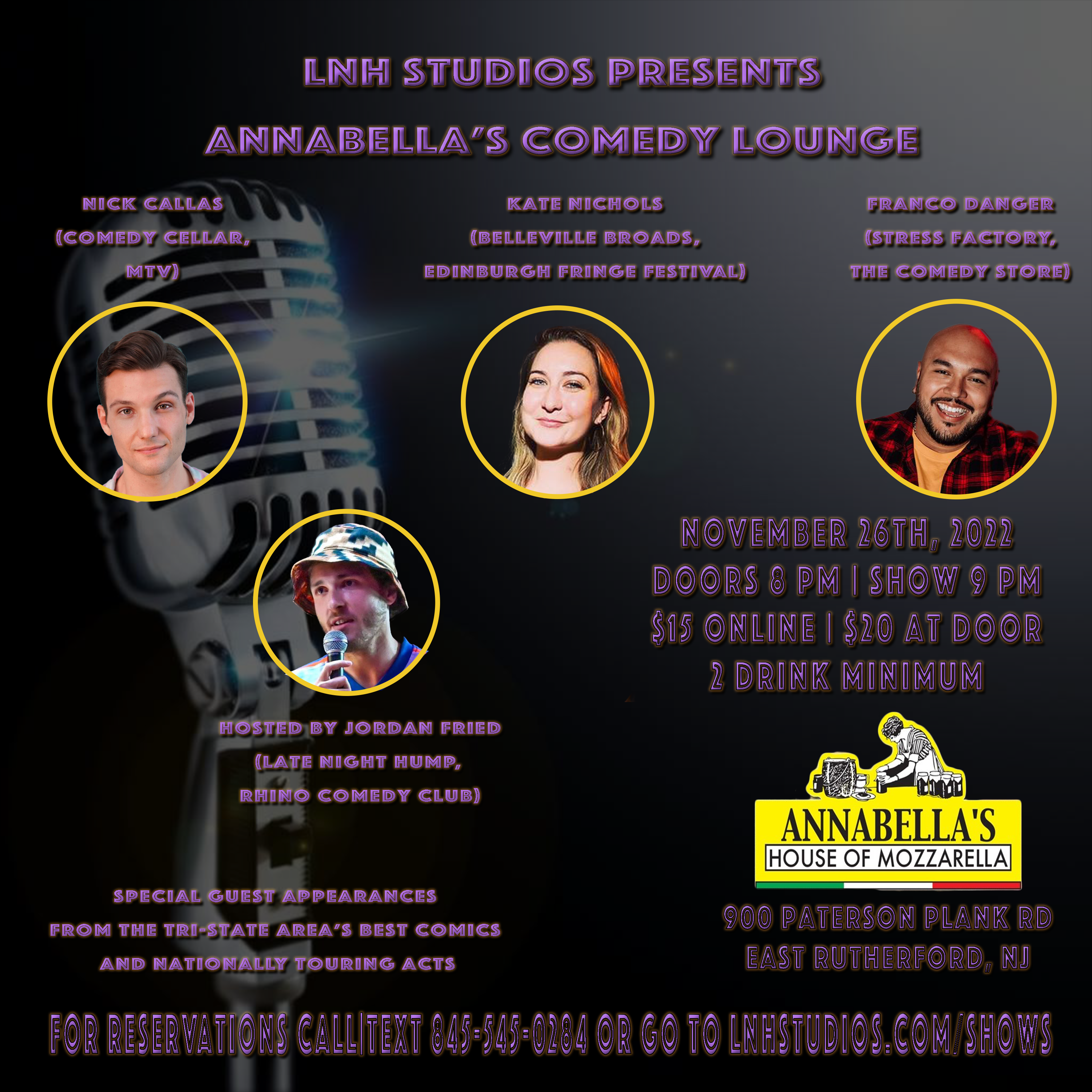 EAST RUTHERFORD, NEW JERSEY, UNITED STATES, November 21, 2022 /EINPresswire.com/ -- Annabella's Comedy Lounge, Presented by LNH Studios, is premiering at Annabella's House of Mozzarella on November 26th, 2022 at 9 PM. Doors open at 8:30 PM.