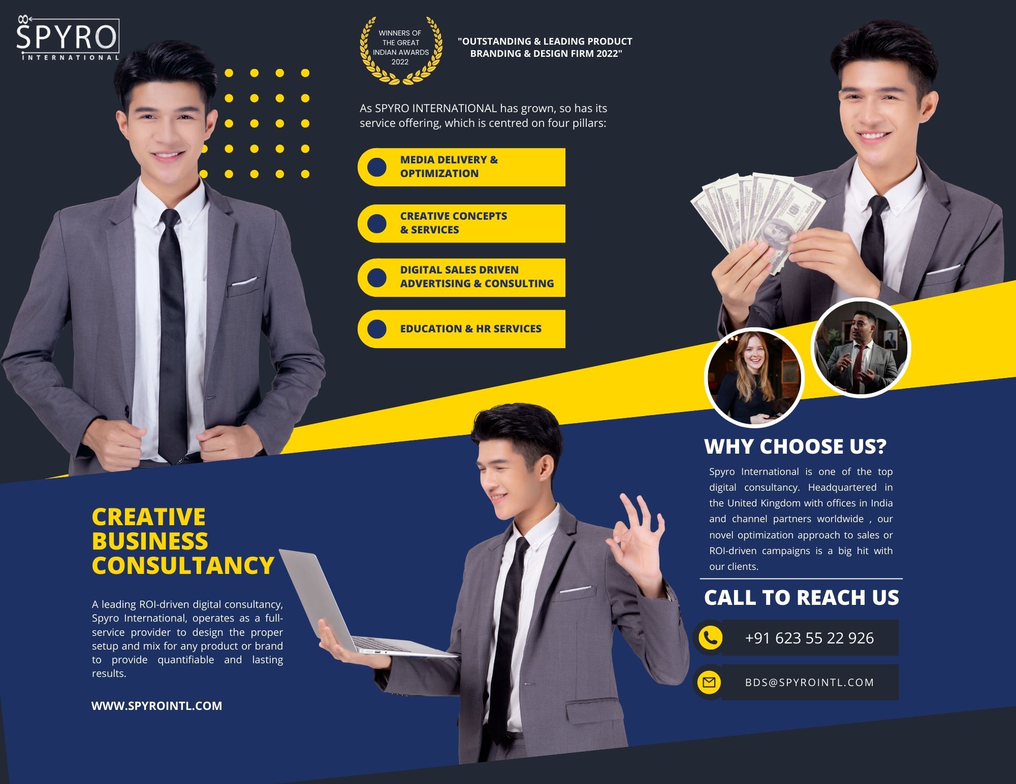 Spyro International provides services in Website design & development, E-commerce portal development, Mobile Applications, Film Editing & Corporate Videos, Logo Designing, Branding, SEO, Digital Marketing, Brand Auditing, International Marketing, and Management Consultancy.