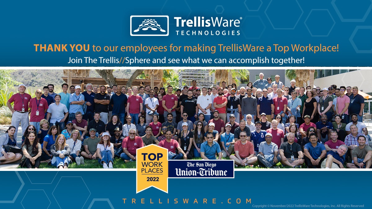 SAN DIEGO, CA, USA, November 23, 2022 /EINPresswire.com/ -- TrellisWare Technologies, Inc., today announced it was awarded a Top Workplaces 2022 honor by The San Diego Union-Tribune for the 3rd year in a row. The Top Workplaces San Diego award is open to all organizations with 50 or more employees in San Diego County. In all, over 3,600 San Diego employers were invited to participate. This year, 115 companies were recognized with this honor, categorized by small, mid-size, and large.