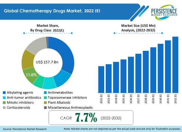 NEW YORK CITY, NEW YORK , UNITED STATES, November 23, 2022 /EINPresswire.com/ -- The chemotherapy drugs market is estimated to be worth US$ 157.7 Bn in 2022 and further increase at a CAGR of 7.7% over the forecast period (2022-2032). Chemotherapy drugs are majorly used for cancer and autoimmune disorder treatment. Because of the high prevalence of cancer and immune disorders, the demand for chemotherapy drugs is increasing, thus propelling the overall market.