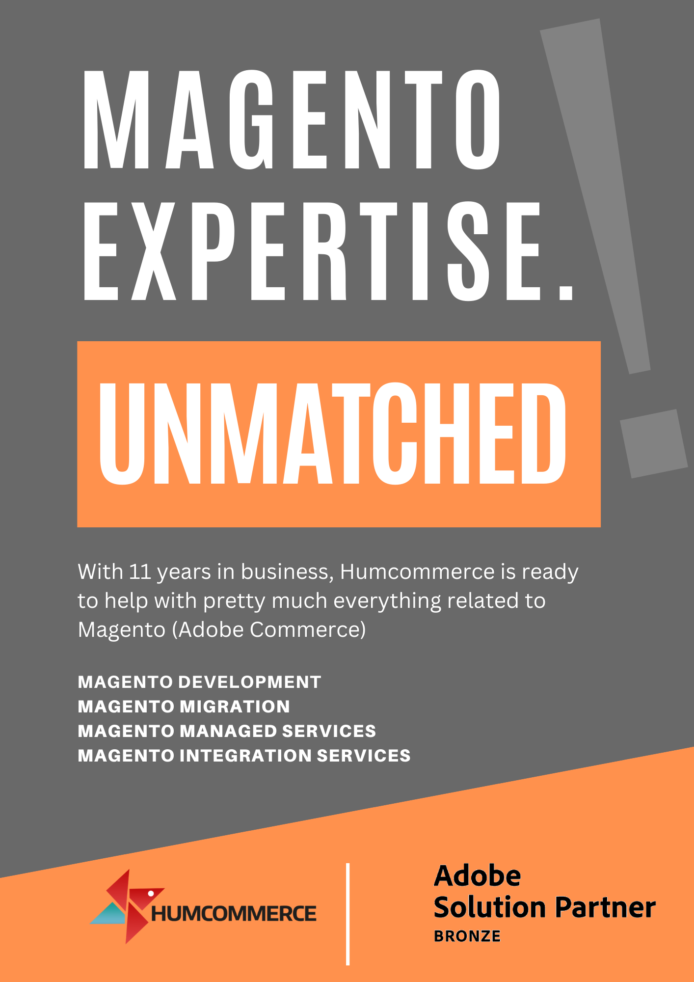 We're called HumCommerce. Simply put, we provide top-notch design, development, re-platforming, integration and managed services for B2B and B2C Magento and WP websites. We have been accredited as a certified "Bronze Partner" of Adobe. With 11 years in business, HumCommerce is ready to help with pretty much everything related to Magento (Adobe Commerce). HumCommerce is a trustworthy company having built few of the world's fastest and most flexible digital storefronts for growing brands.