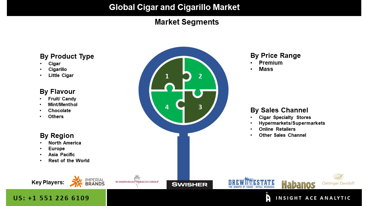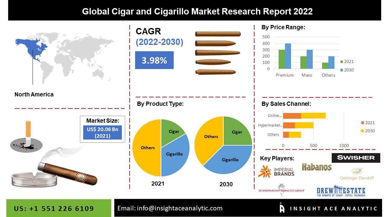 NEW JERSEY, NJ, USA, November 28, 2022 /EINPresswire.com/ -- Insight Analytics Pvt. Ltd. announces the release of a market assessment report on the "Global Cigar and Cigarillo Market (By Product Type (Cigars, Cigarillos, and Little Cigars), Flavor (Fruit/Candy, Mint/Menthol, Chocolate, and Others), Price Range (Premium and Mass), Sales Channel (Direct Sales, Cigar Specialty Stores, Hypermarkets/Supermarkets, Online Retailers, and Other Sales Channels))- Market Outlook and Industry Analysis 2030"
