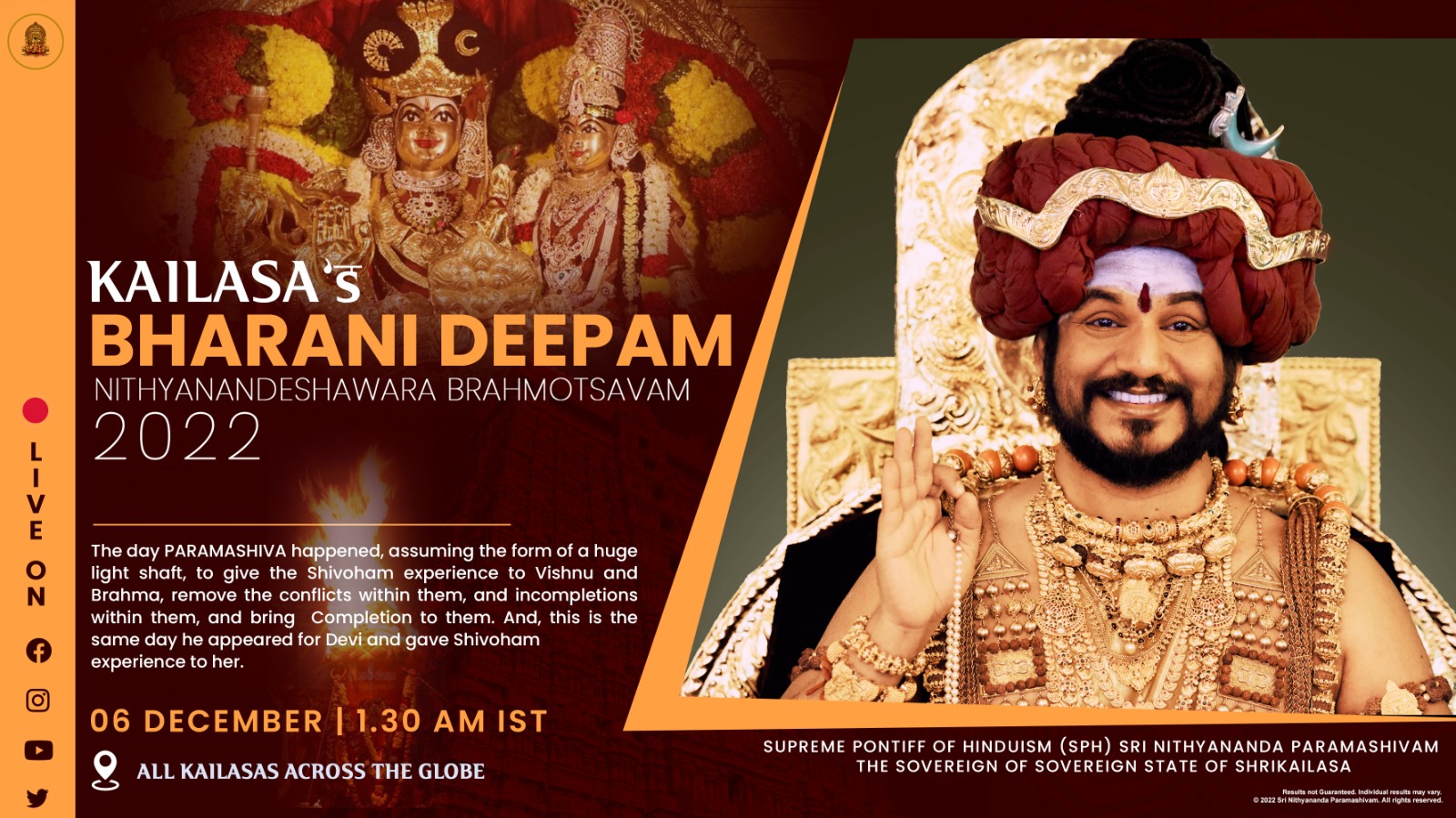KAILASA invites you to join in the grand celebrations of Kartigai Deepam on December 6. Join us live on our social media platforms and receive the blessings of The SPH Bhagavan Nithyananda Paramashivam. The SPH Nithyananda Paramashivam will be gracing us with a live Presidential Address.