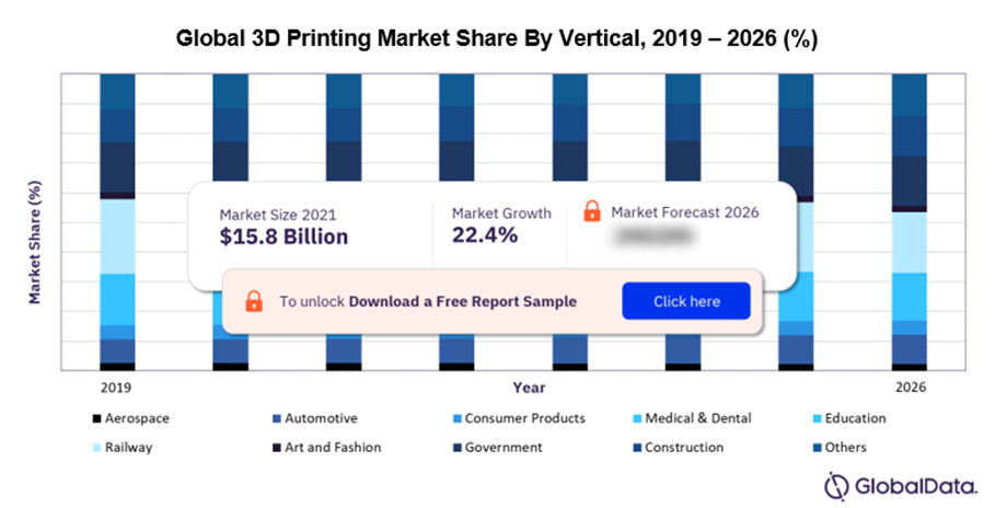 LONDON, UK, November 28, 2022 /EINPresswire.com/ -- The global 3D printing market size reached USD 15.8 billion in 2021, according to a new report by GlobalData Plc. The paradigm shift in acceptance of 3D printing as digital manufacturing and not limited to prototyping is expected to influence the market over the forecast period. Integration of 3D printing in production processes benefits organizations by reducing costs and increasing efficiency. The need to improve productivity and automate tasks translates to a rise in demand for software that increases process efficacy. Incorporating simulation into the 3D printing workflow can help reduce cost elements such as consumables and machine time. Simulating the 3D print process can make it easier for production operators to spot potential errors before a build starts. The benefits offered by 3D printing solutions make them a preferred option for technological adoption in manufacturing/production processes.