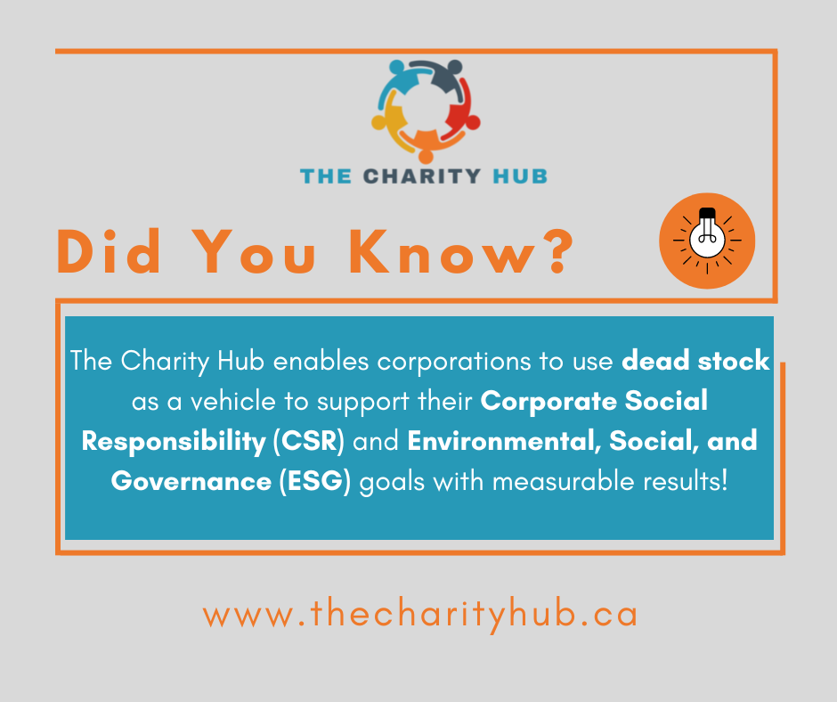 TORONTO, ONTARIO, CANADA, December 1, 2022 /EINPresswire.com/ -- The Charity Hub (TCH) is a social enterprise specializing in excess inventory and helping global companies re-market inventory responsibly and sustainably. TCH enables corporations to use dead stock as a vehicle to support their Corporate Social Responsibility (CSR) and Environmental, Social, and Governance (ESG) goals with measurable results. TCH then donates 50% of its net profits to a charity of the supplier’s choice, to empower their community while fostering employee and customer loyalty.