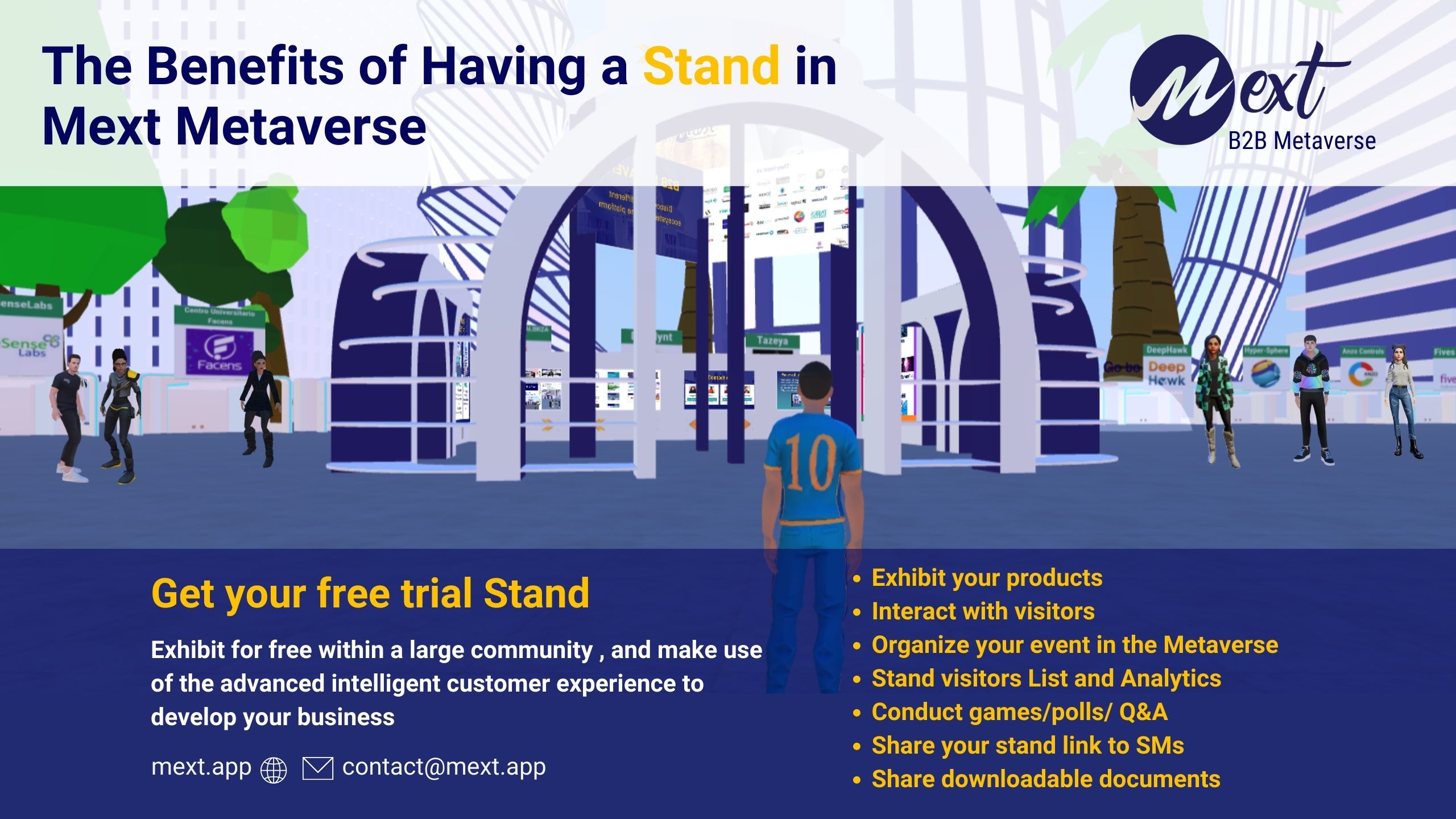 To own your stand or your showroom at Mext B2B Metaverse, request a free trial at contact@mext.app .
